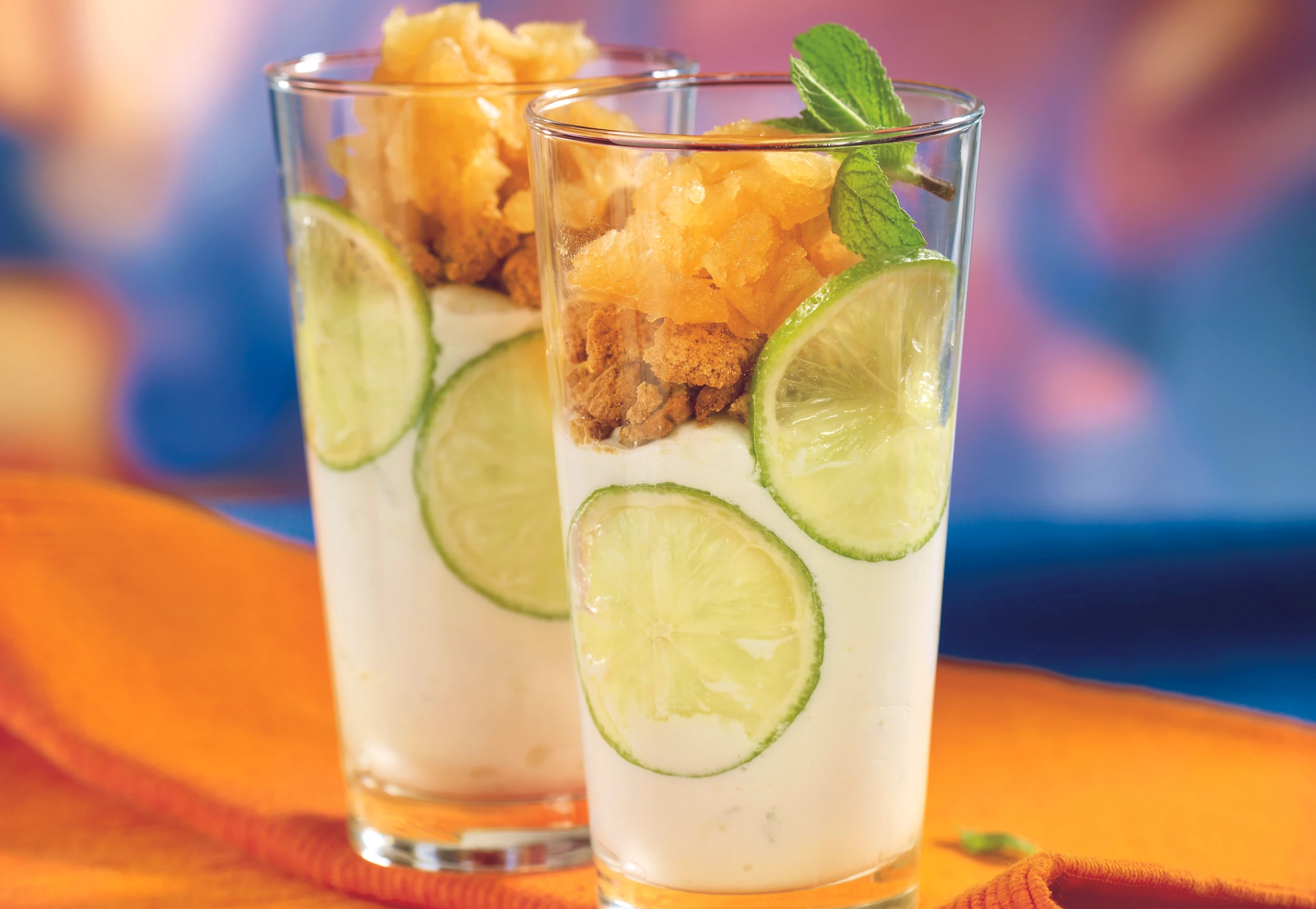 Limettenscheiben in 4 Gläsern verteilen, Creme ein-füllen, Brösel darauf verteilen. Granitée mit einem Löffel aus der Form schaben und auf den Bröseln verteilen. Limetten-Becher mit Minze garnieren und rasch servieren.