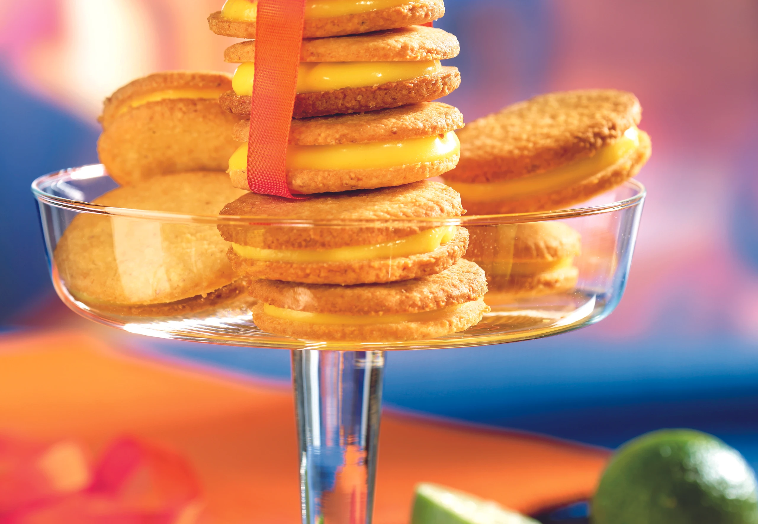 Für die Limettenfülle alle Zutaten, außer der Butter, unter Rühren aufkochen. Butter in kleine Stücke schneiden und in die heiße Masse rühren, Fülle kalt stellen.
