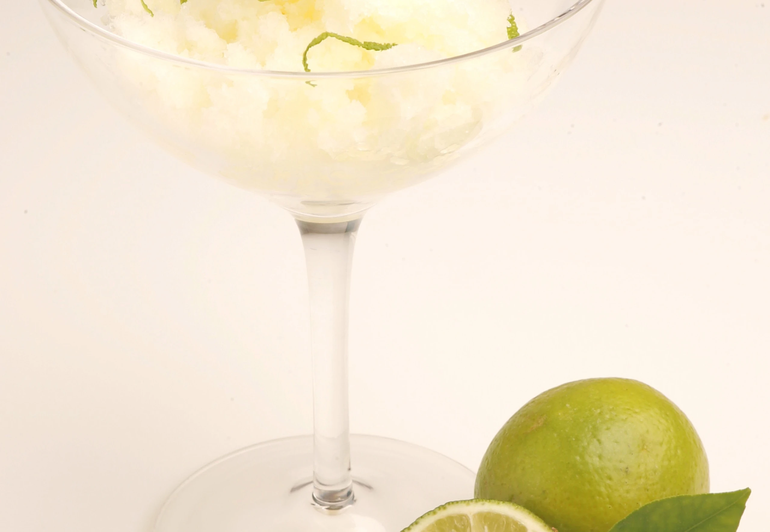 Zum Anrichten das Granité mit einem Löffel abschaben und in gekühlte Gläser füllen, mit Limettenzesten garnieren. Granité sofort servieren.
