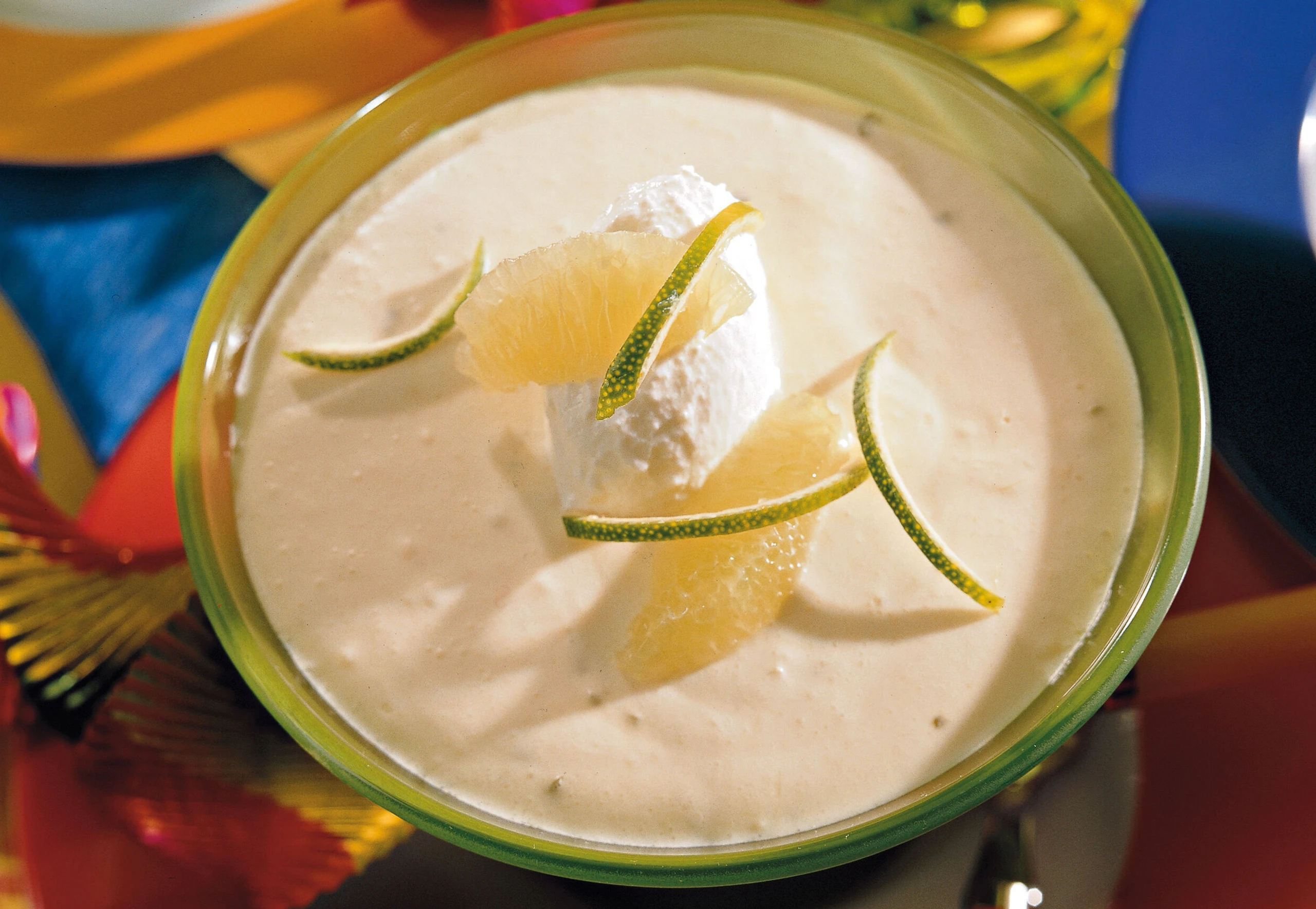 Aus dem Sauerrahm Nockerl ausstechen und auf die Cremeportionen setzen. Mit Limettenfilets und -streifen garnieren.