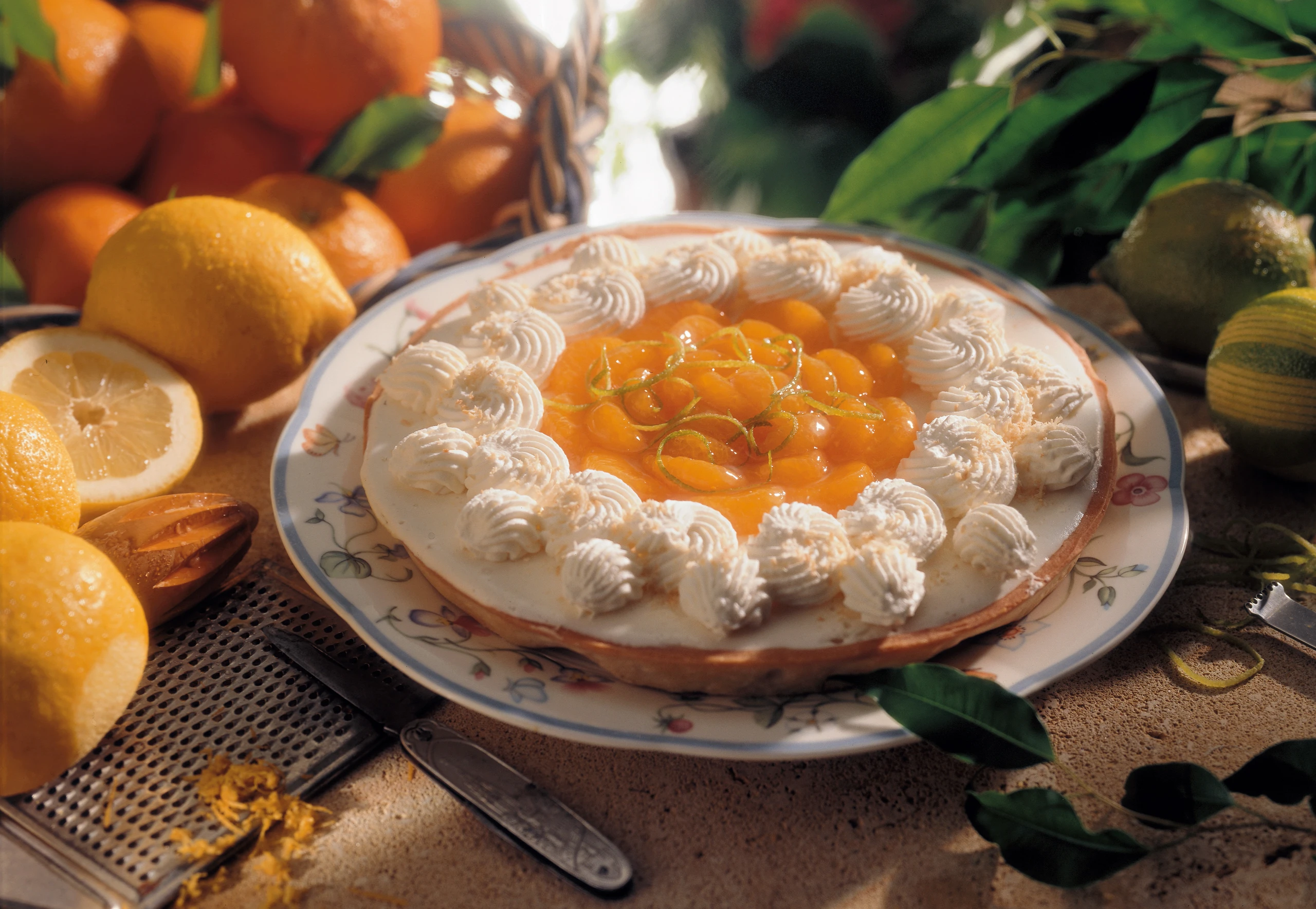 Für die Garnitur Mandarinenkompott abseihen und gut abtropfen lassen. Tortengelee nach Vorschrift zubereiten. Torte mit den Früchten belegen, mit den Limettenstreifen bestreuen und mit Tortengelee bestreichen. Obers schlagen. Torte mit Obersrosetten verzieren und diese mit Kokosette bestreuen.