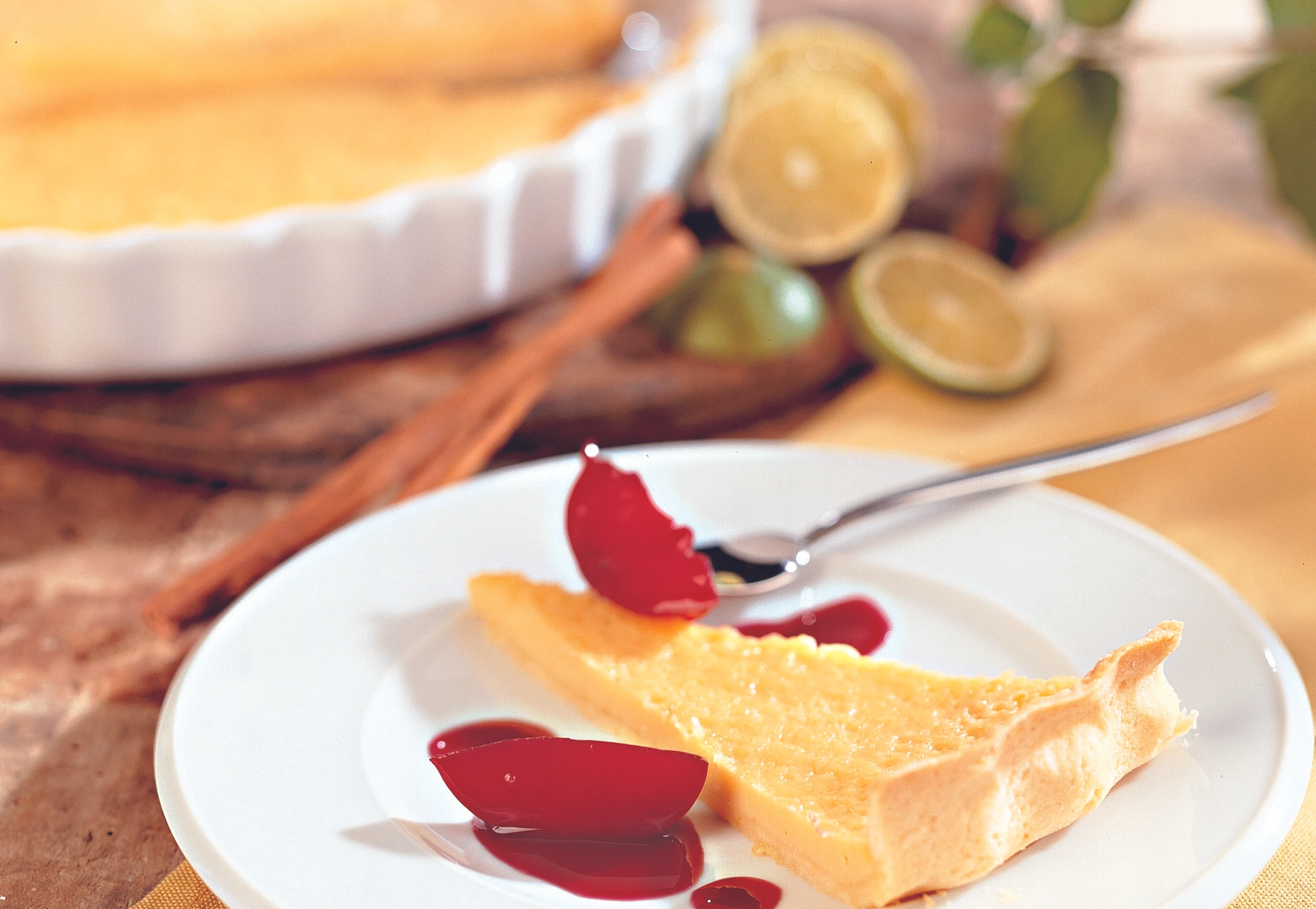 Limettentarte mit den Rotwein-Zwetschken servieren.