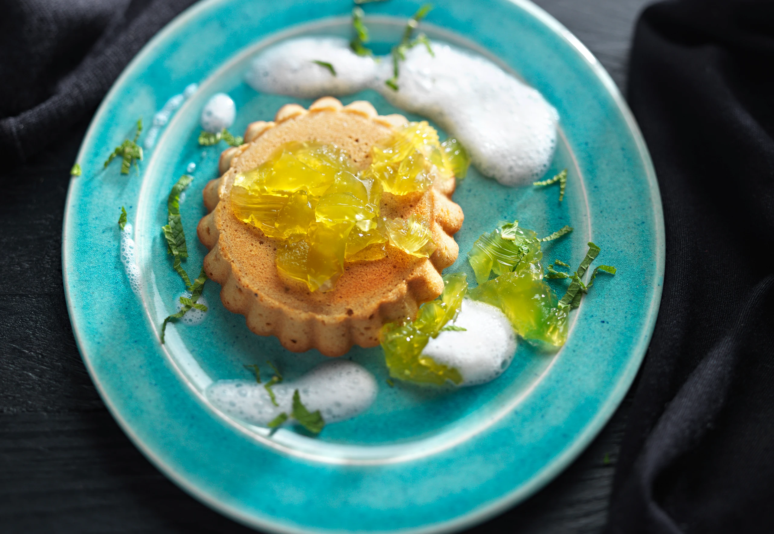 - Für die Tränke Wasser, Limettensaft und Zucker aufkochen, vom Herd nehmen. Törtchen mit der Mischung tränken, anrichten, mit Gelee und Schaum servieren, mit geschnittener Minze garnieren.