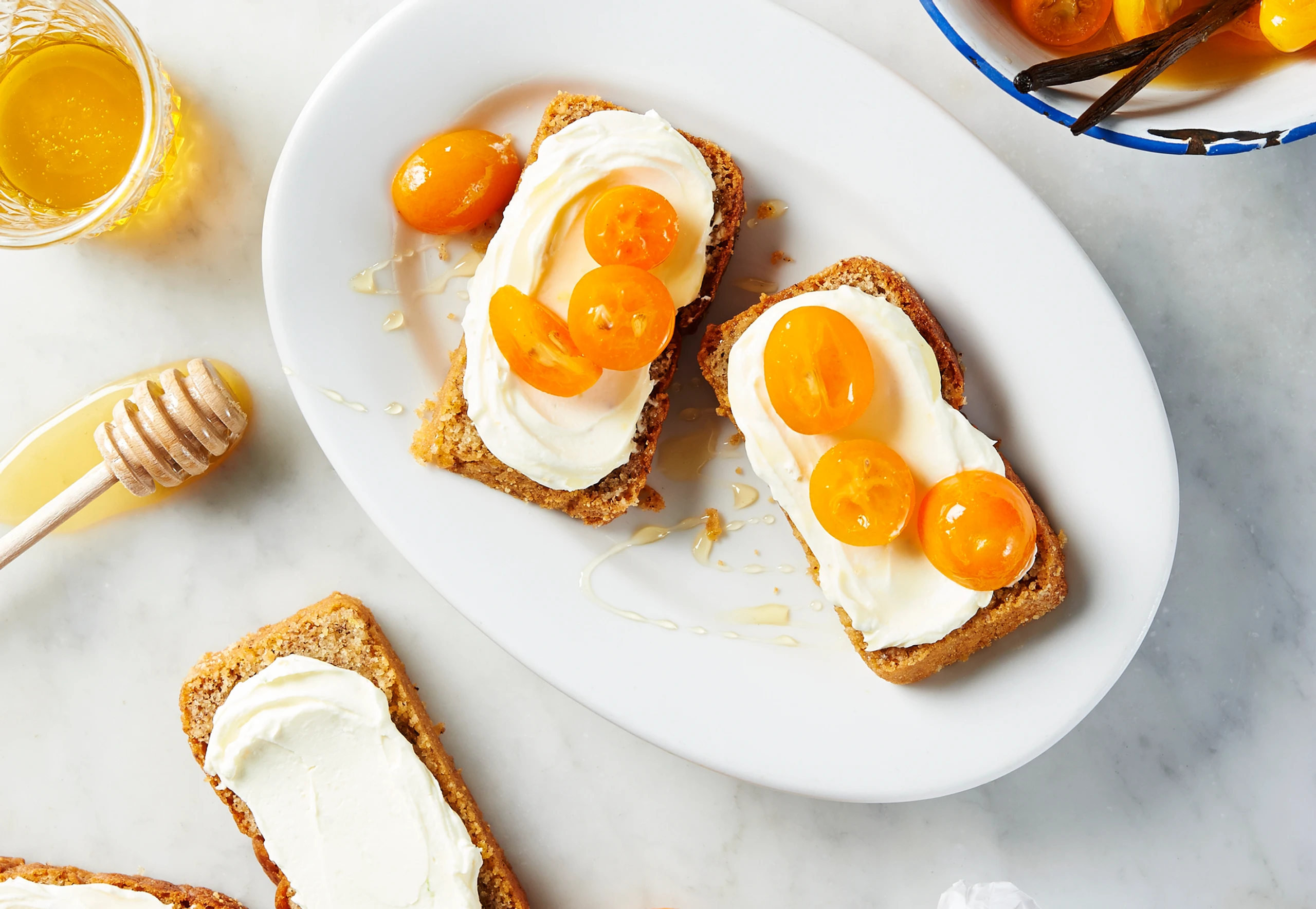 Kuchen aufschneiden und mit der Creme bestreichen. Kumquats darauf verteilen und nach Belieben mit Honig beträufeln.