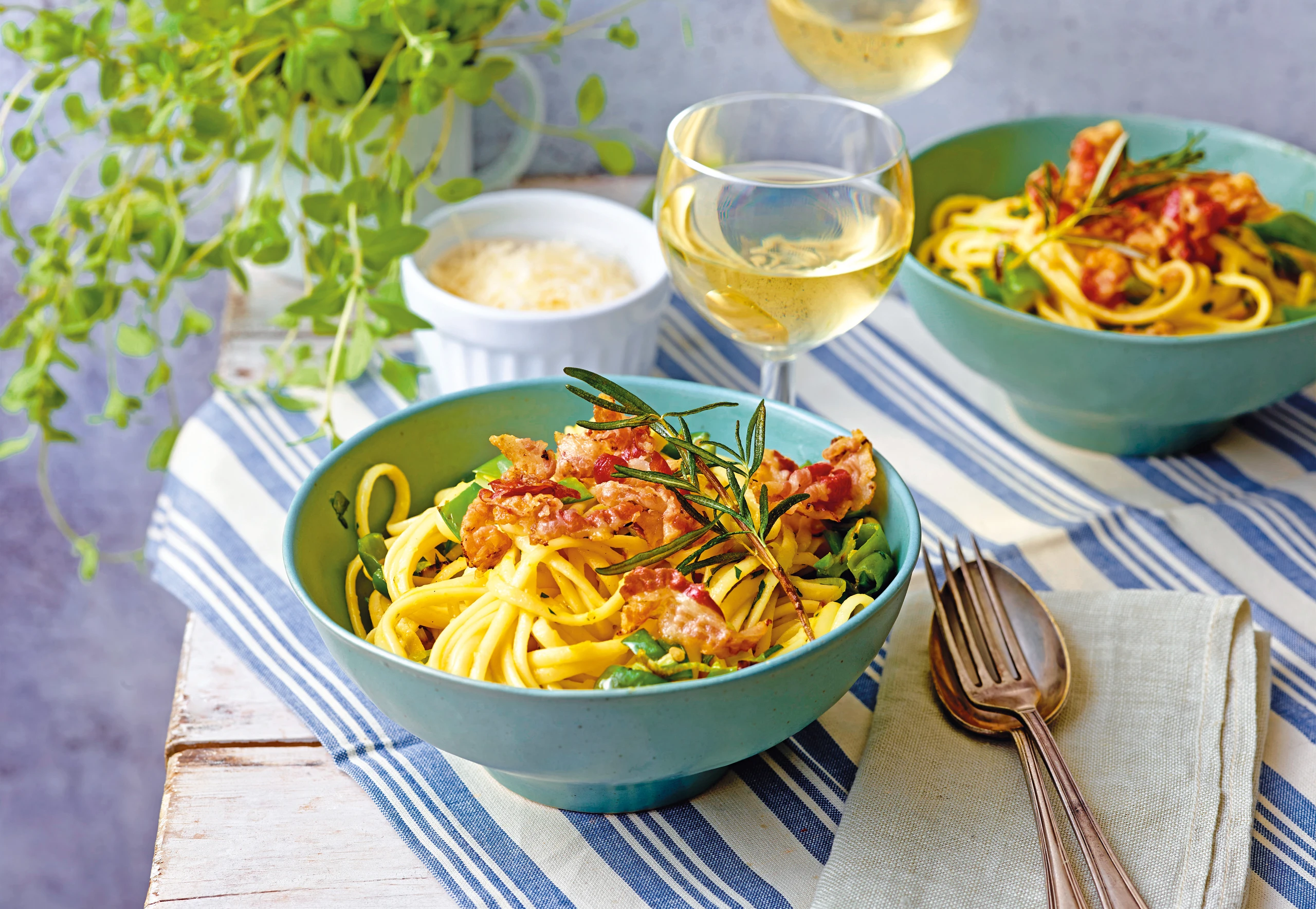 Linguine in reichlich Salzwasser bissfest kochen, abseihen, abtropfen lassen und mit Sauce und Gemüse vermischen. Anrichten, mit Grana und Pancetta garnieren und eventuell mit gebratenen Rosmarinzweigen garnieren.