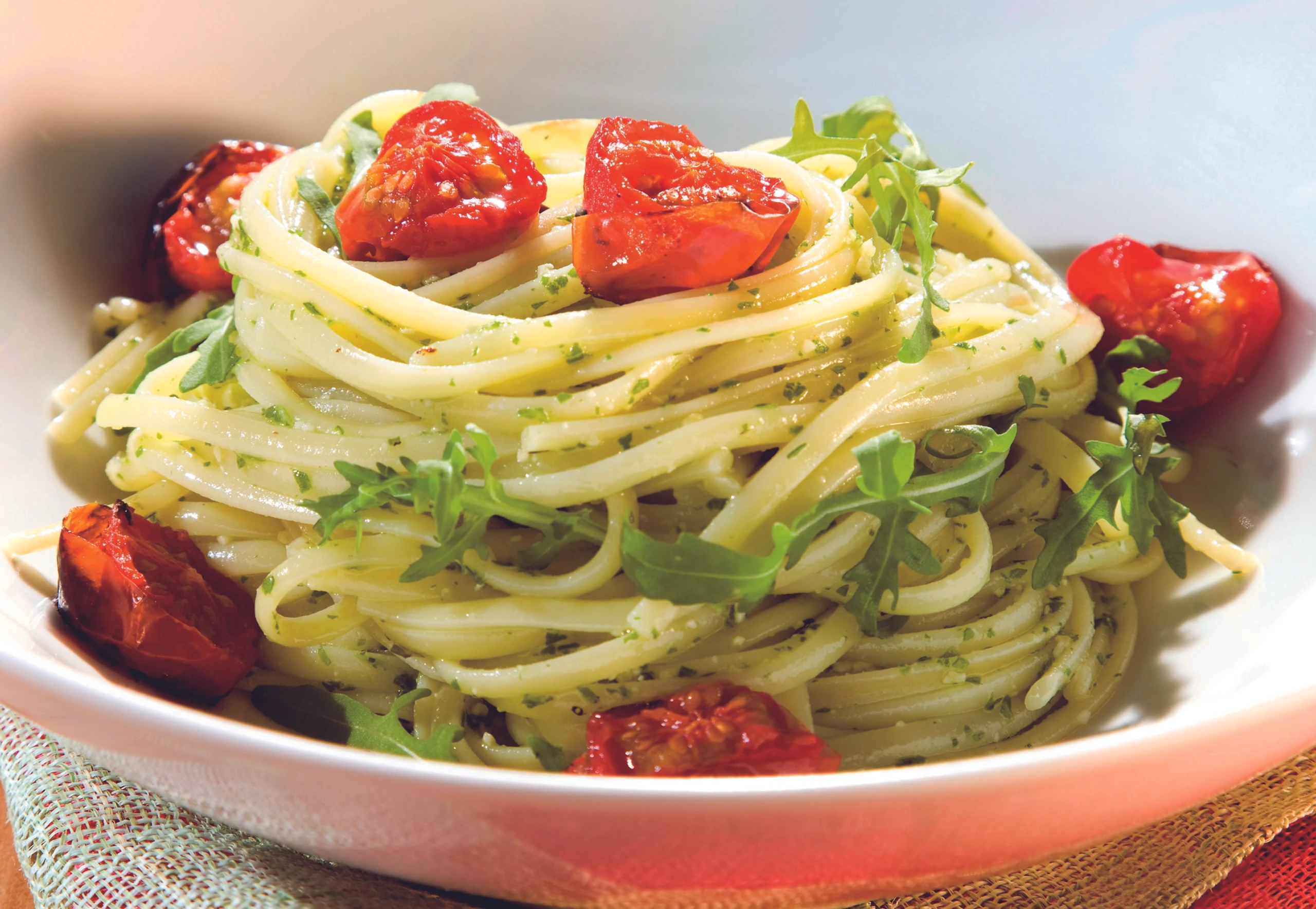 Linguine mit Rucola-Pesto und Schmorparadeisern