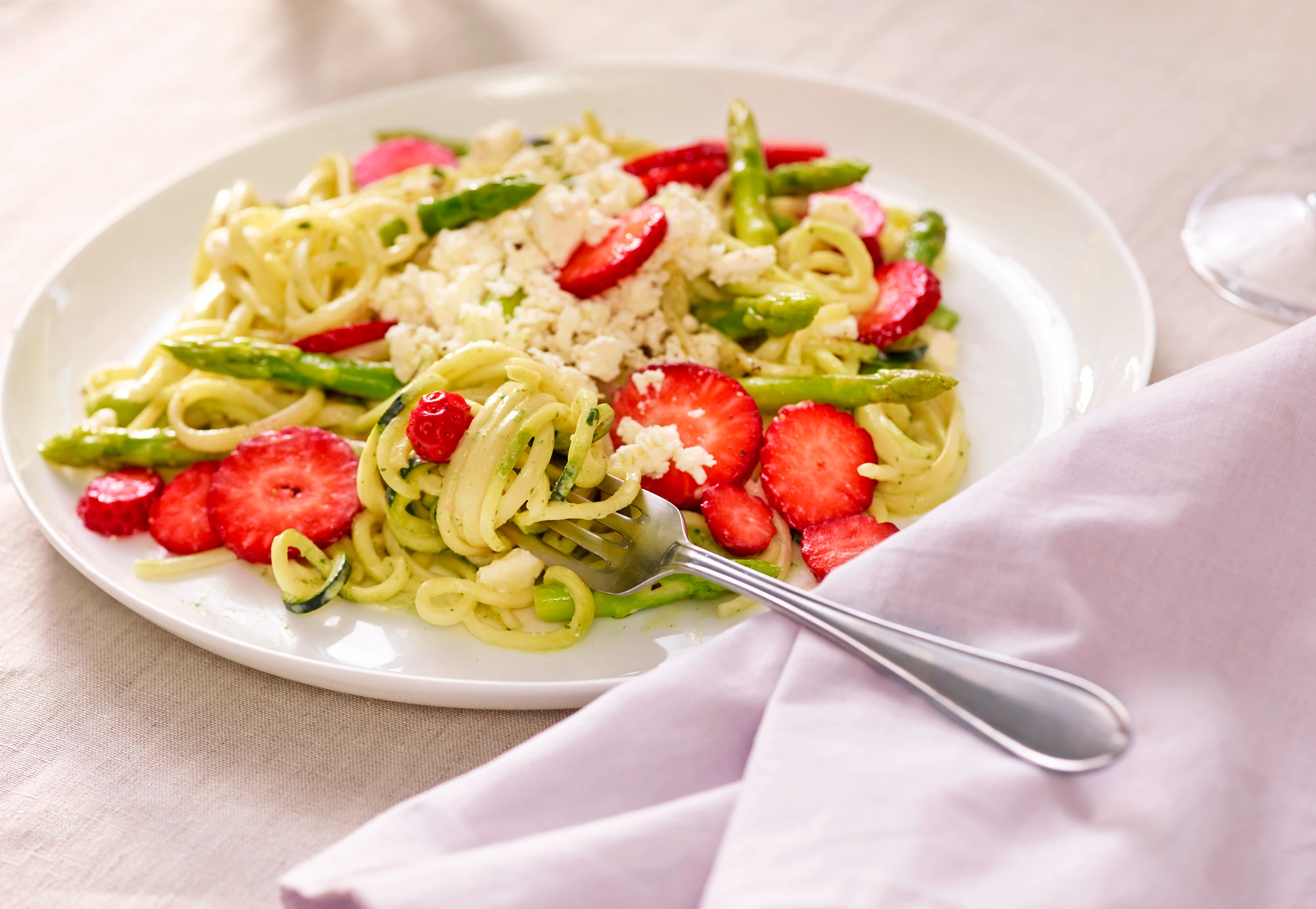 Linguine mit Zucchini, Spargel und Erdbeeren