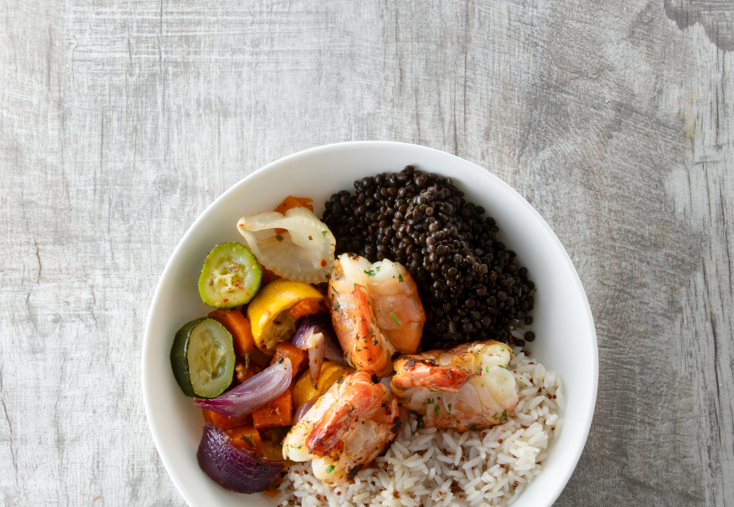 Linsen-Gemüsebowl mit Reis und Knoblauch-Garnelen