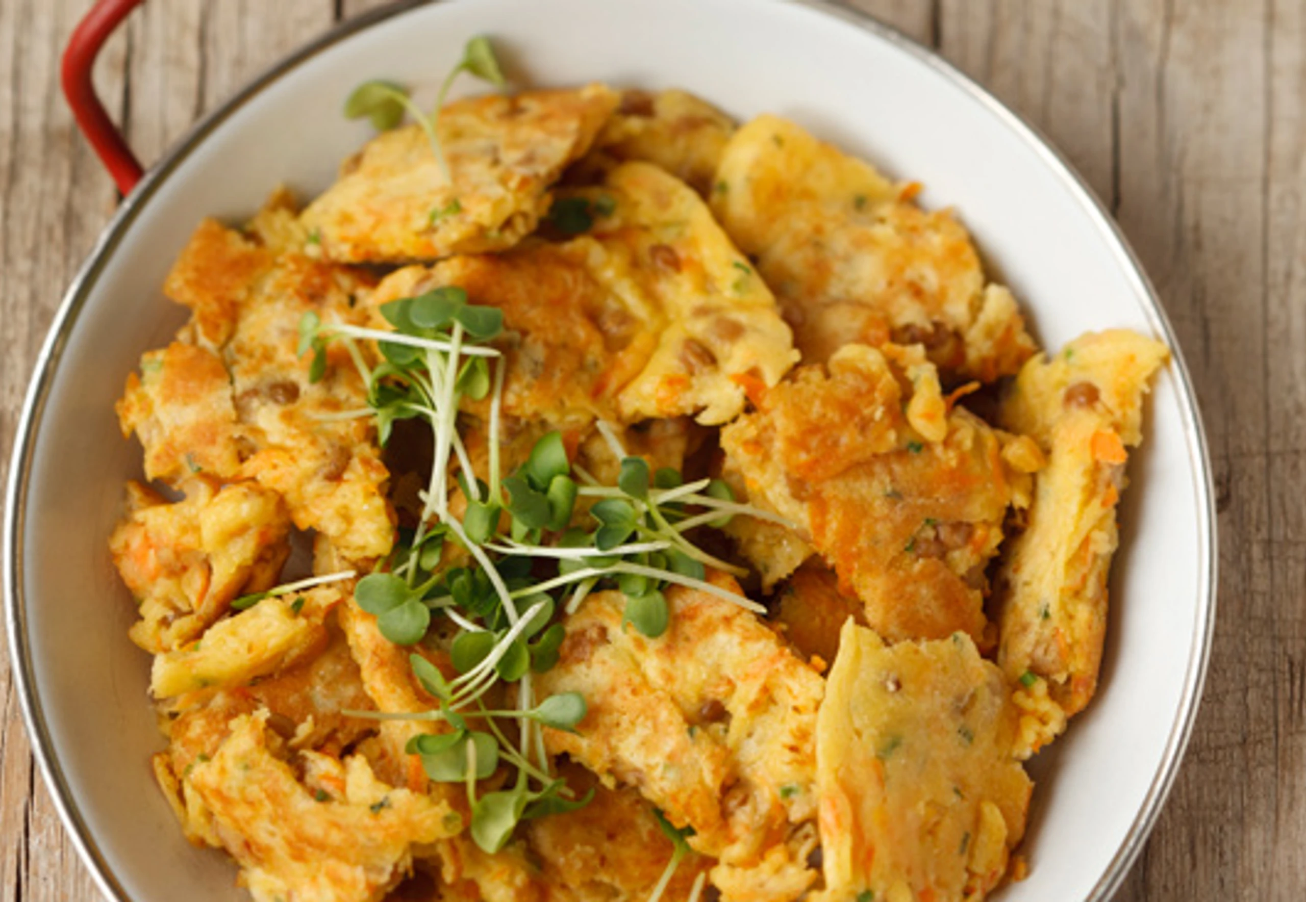 Rohr auf 180°C vorheizen. Linsen in einem Sieb abtropfen lassen. Karotten schälen und grob raspeln. Kresseblättchen von den Stielen schneiden.