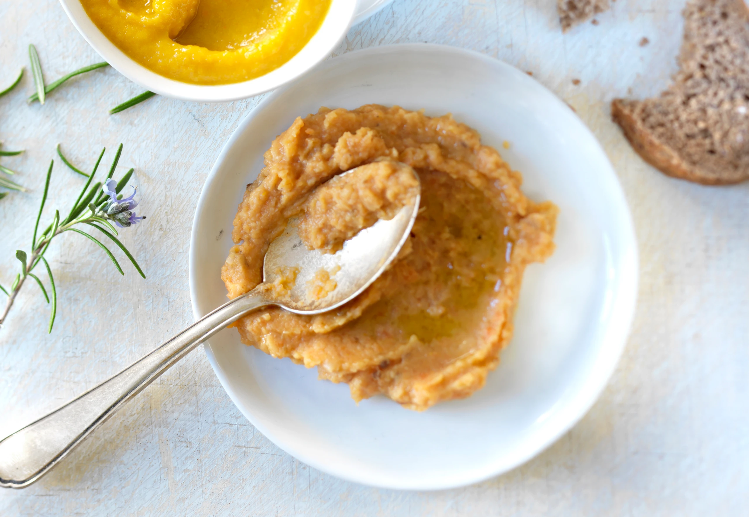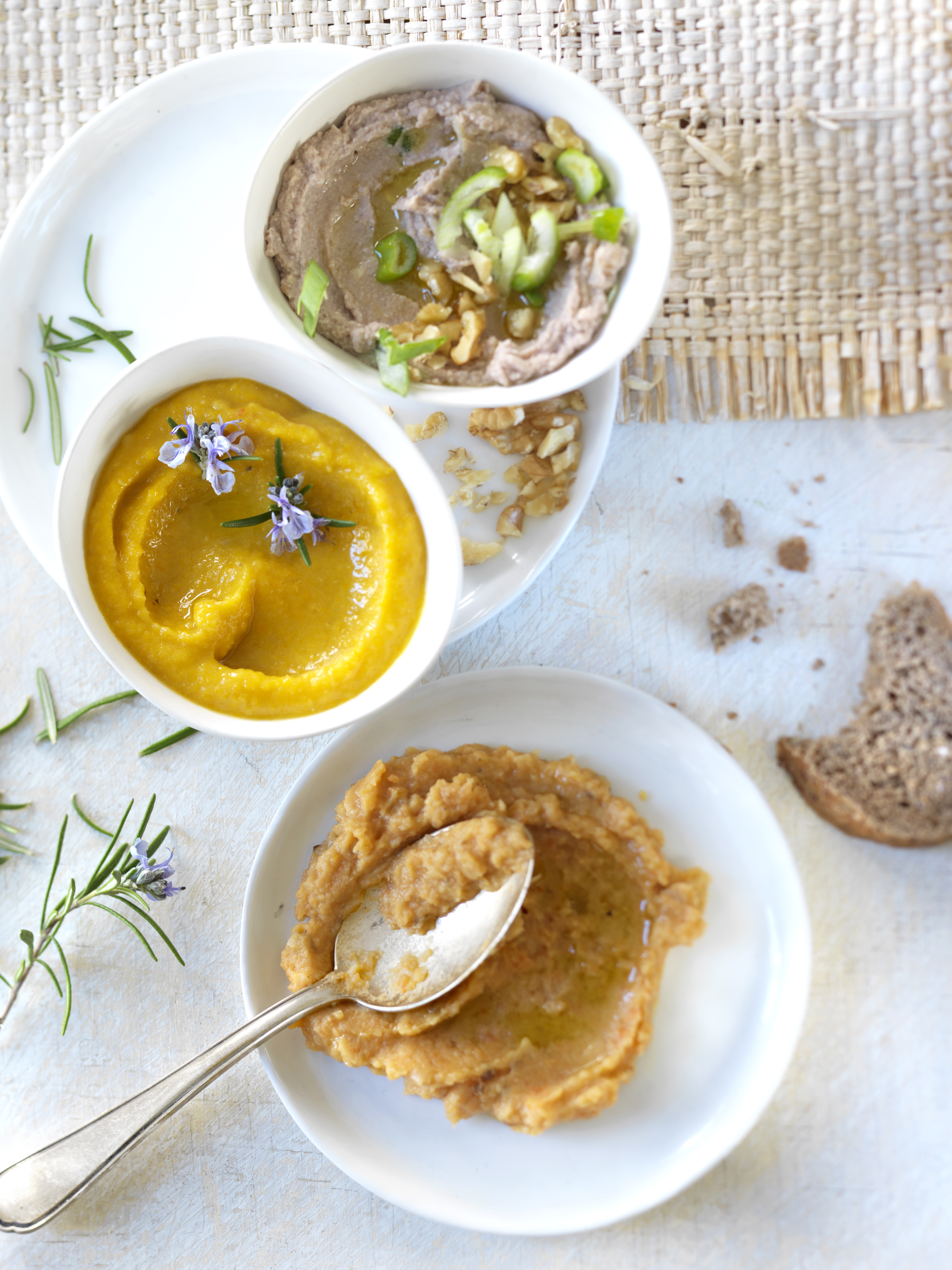 Paprika herausnehmen, kurz überkühlen lassen, Strunk und Kerne entfernen, Haut abziehen. Paprika klein schneiden, mit Linsen und Olivenöl fein pürieren, mit Salz und Pfeffer abschmecken, mit Rosmarin bestreuen.