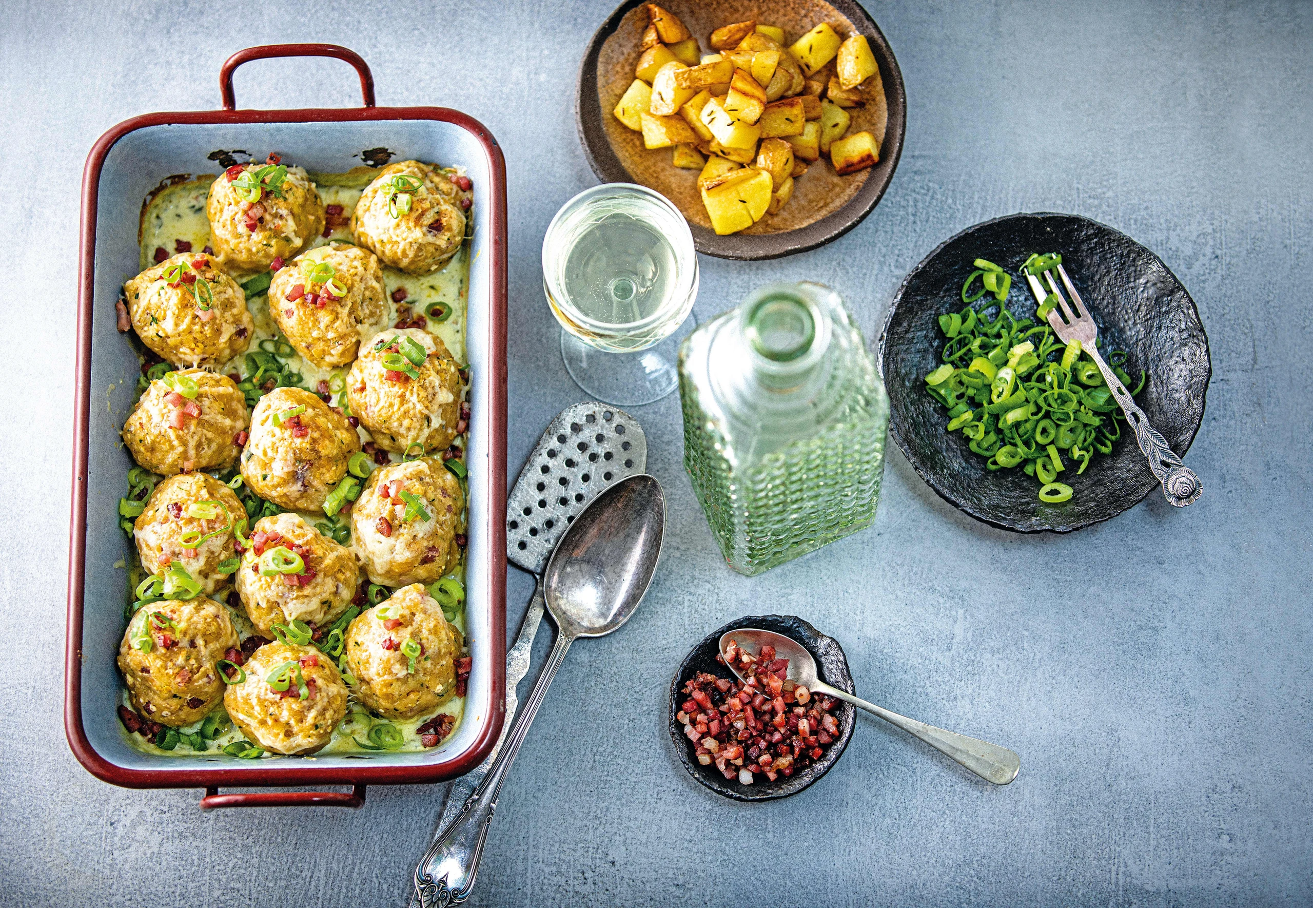 Jungzwiebel putzen und in dünne Ringe schneiden. Bällchen mit Jungzwiebeln und übrigem Speck bestreut servieren.