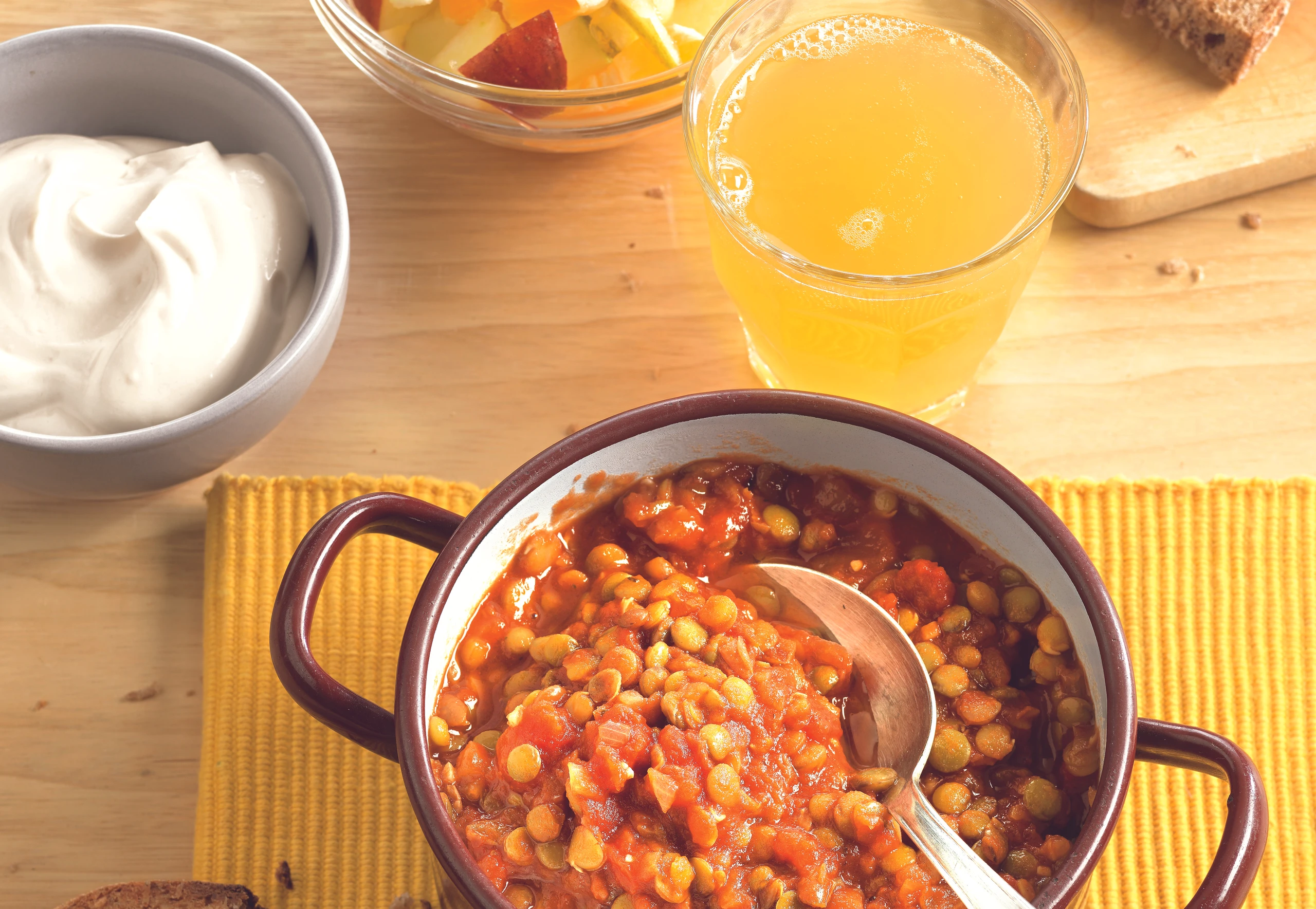 Paradeissauce mit den Linsen vermischen. Linseneintopf mit Gemüsesuppe, Salz und Pfeffer abschmecken, noch ca. 7 Minuten köcheln lassen. Dazu schmeckt Vollkornbrot.