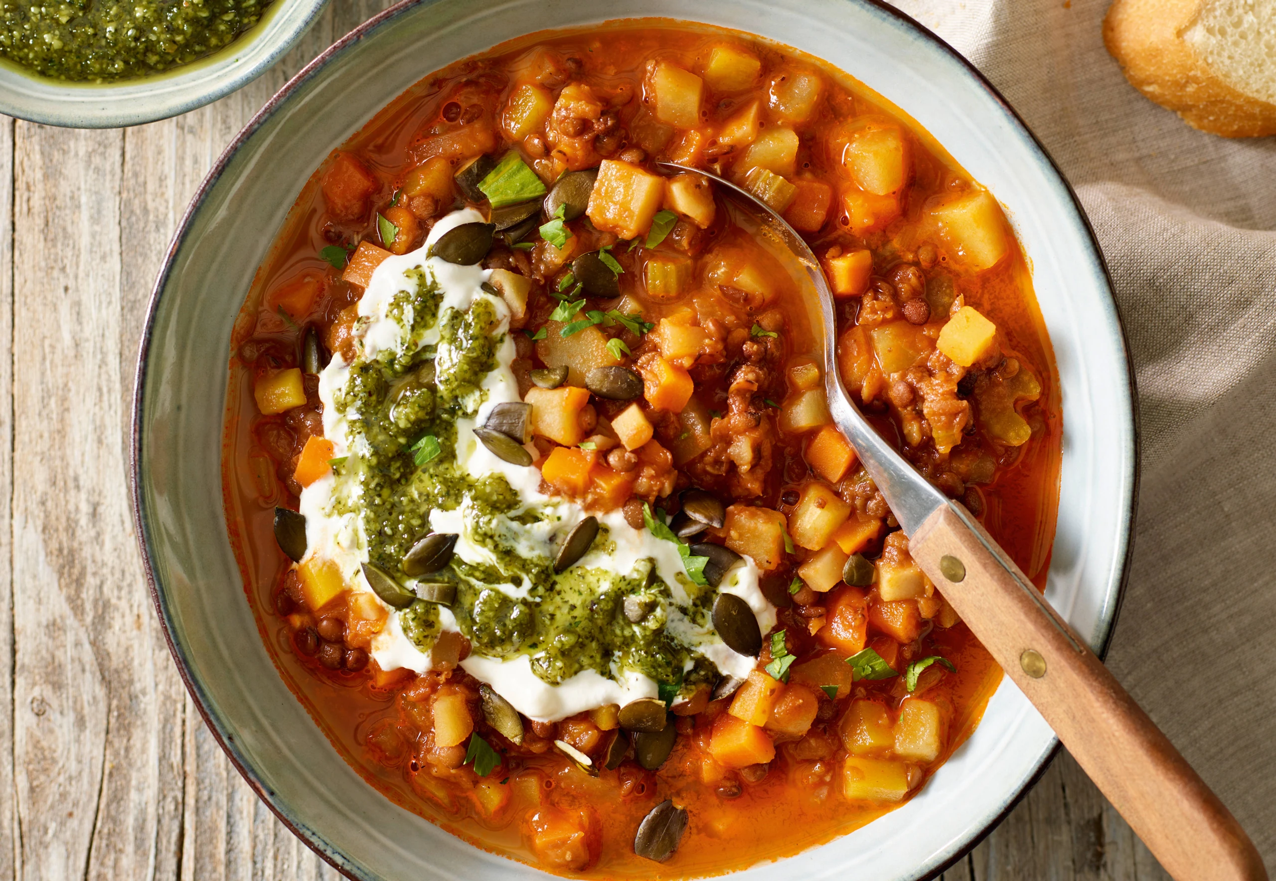 Linseneintopf in Schüsseln anrichten und mit Rahm, Pesto, Kürbiskernen und Petersilie (vom Suppengrün) garniert servieren.