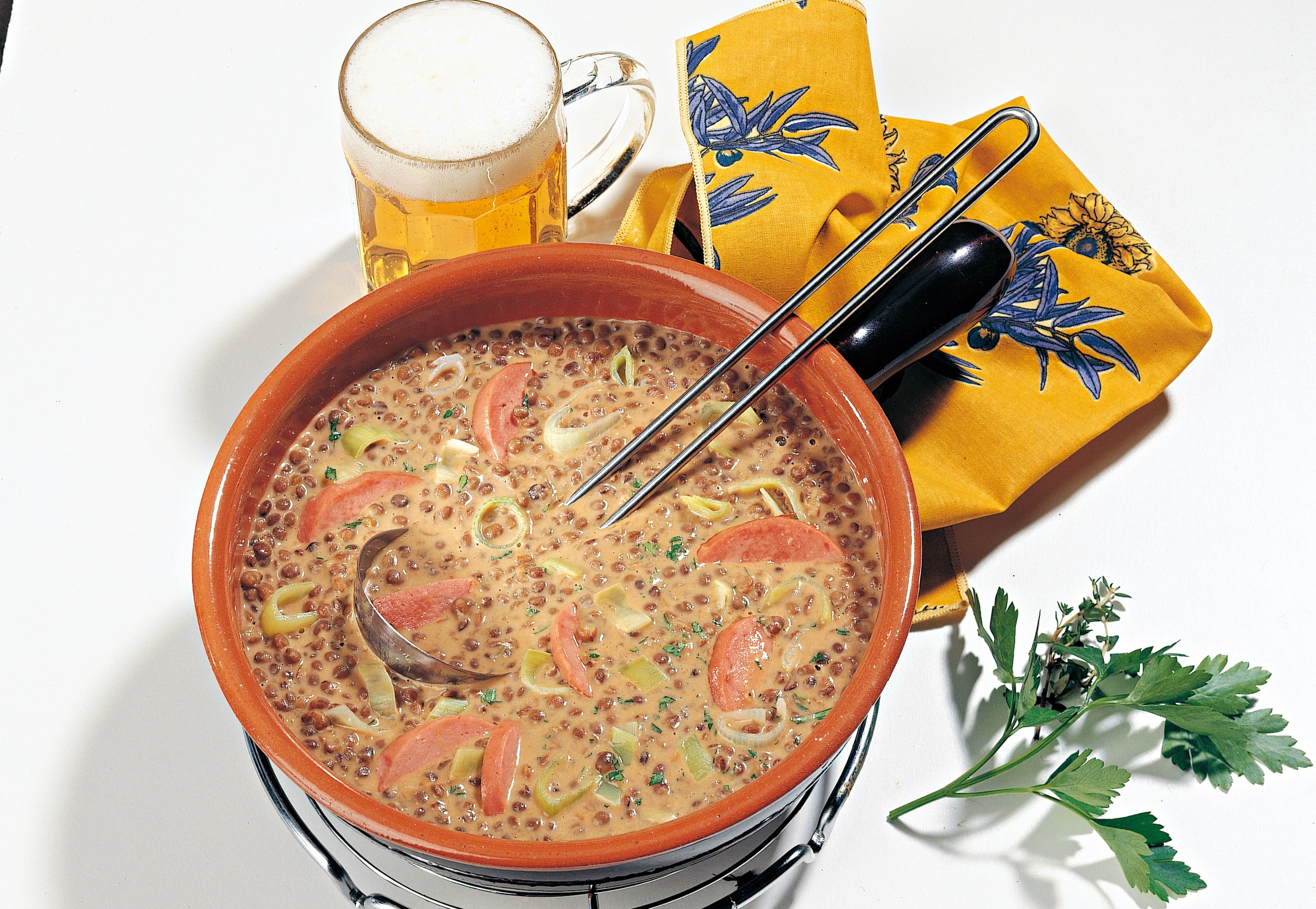 Linsen auf ein Sieb schütten, kalt spülen und gut abtropfen lassen. Wurst enthäuten, der Länge nach halbieren und die Hälften in ca. 1 cm dicke Scheiben schneiden. Lauch putzen, waschen und in ca. 1 cm dicke Scheiben schneiden.