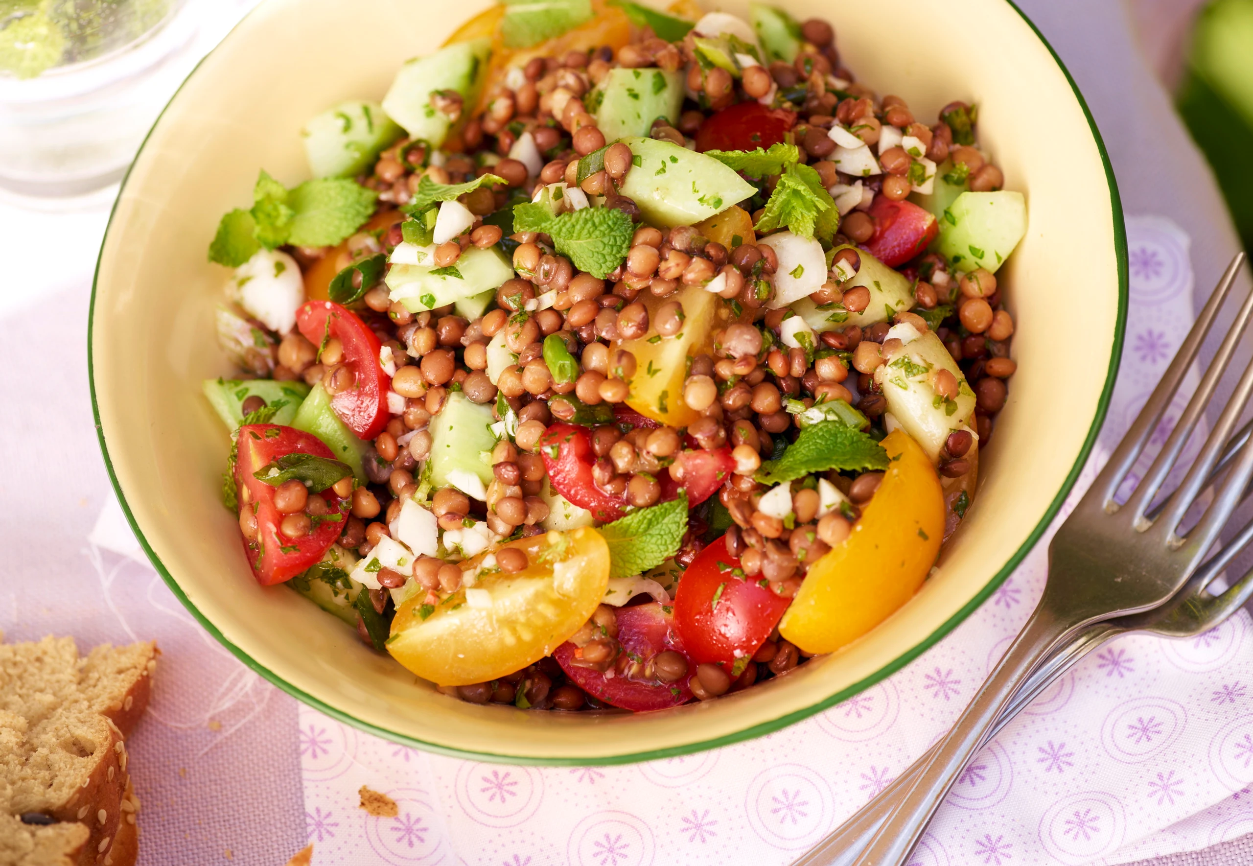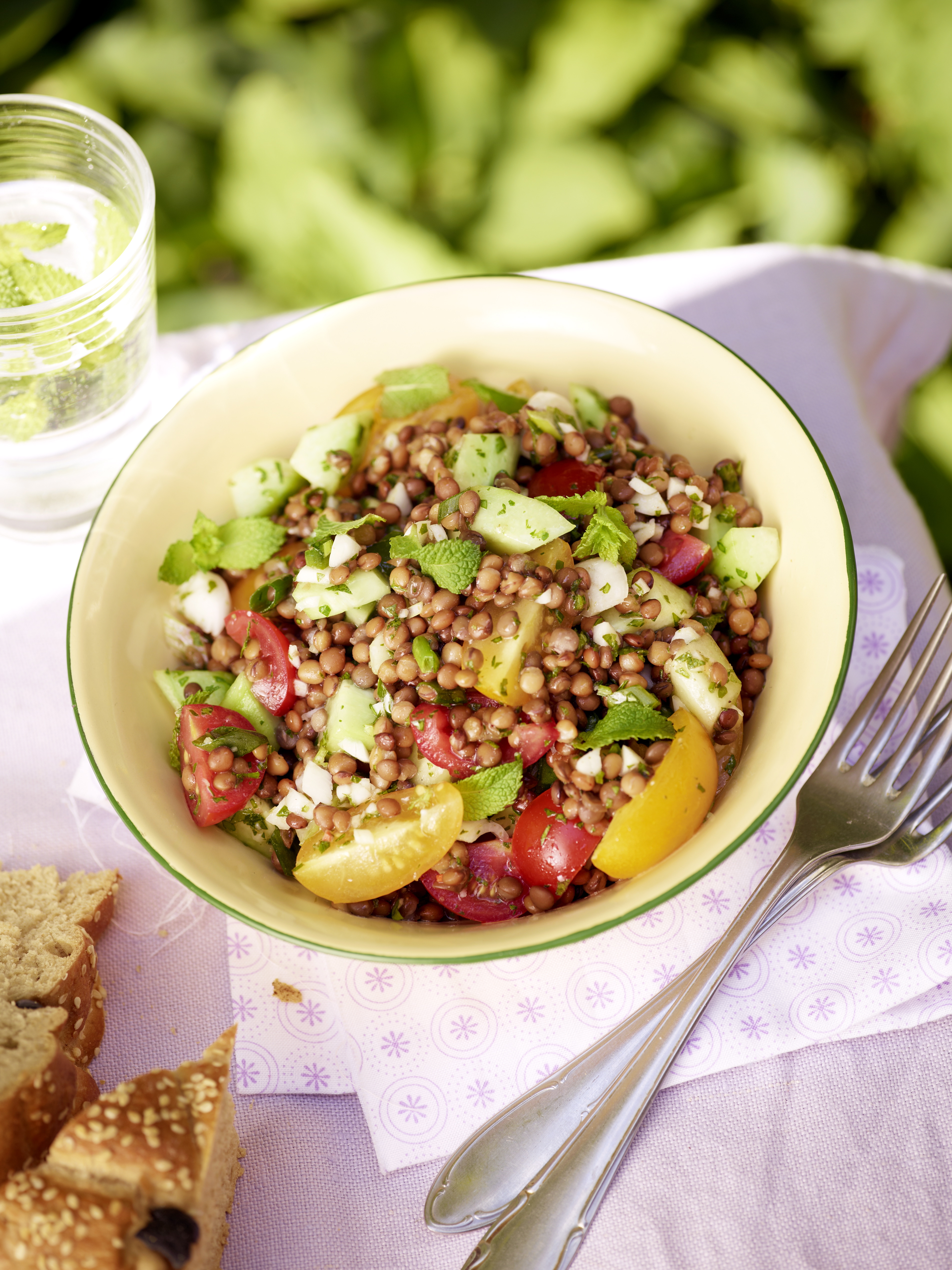 Zwiebel und Knoblauch in 1 EL Öl anschwitzen, zuerst mit den Linsen, dann mit der Paradeiser-Gurkenmischung verrühren. Kräuter unterrühren. Salat kurz ziehen lassen und mit Fladenbrot servieren.