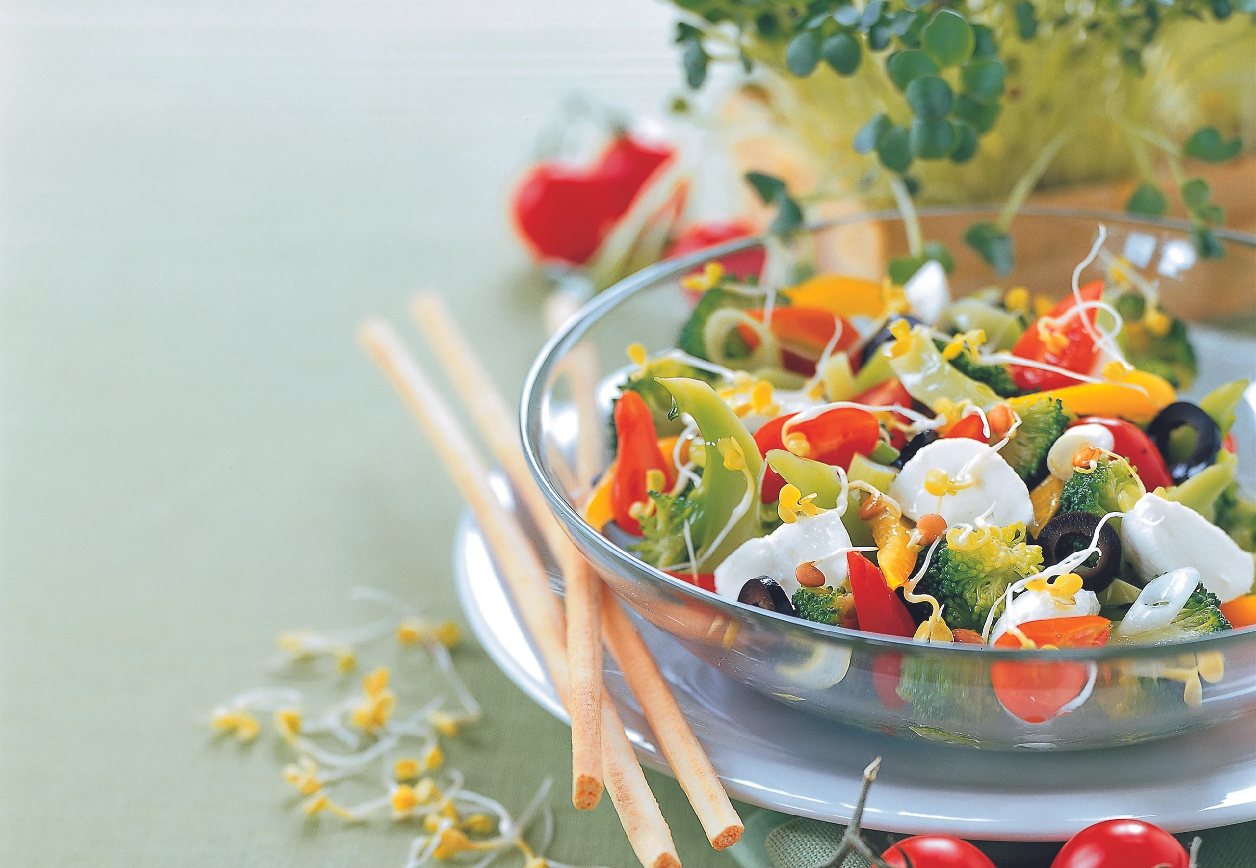 Paradeiser, Jungzwiebeln, Knoblauch, Oliven, Essig und Öl vermischen, mit Salz und Pfeffer würzen.