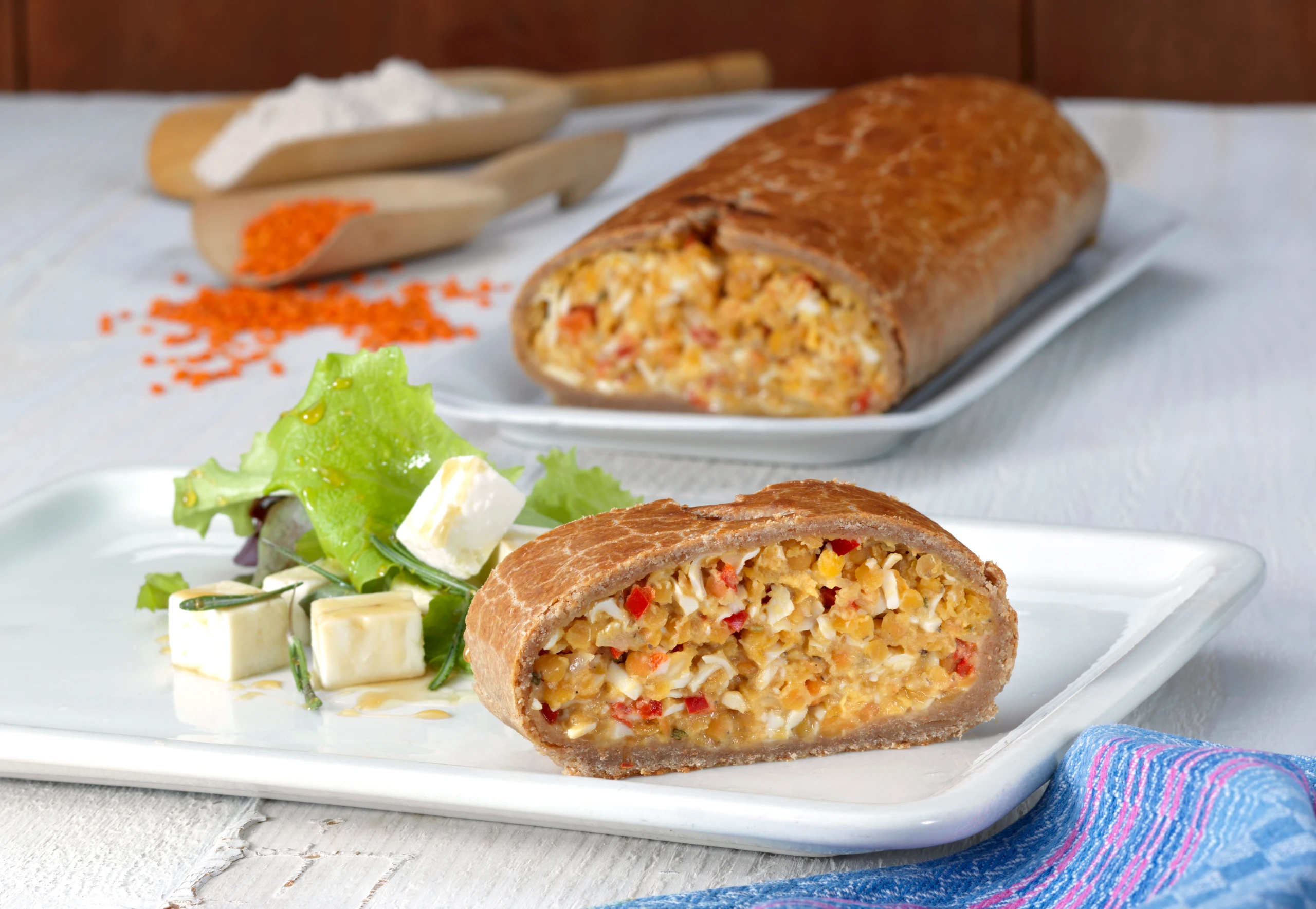 - Teigränder mit verquirltem Ei bestreichen. Fülle auf einem Drittel des Teiges auftragen. Teig seitlich einschlagen und über die Fülle einrollen. Strudel auf das Blech legen, mit Ei bestreichen und mit einer Gabel mehrmals einstechen. Im Rohr (mittlere Schiene) goldbraun backen (ca. 30 Minuten). Mit dem Salat servieren.