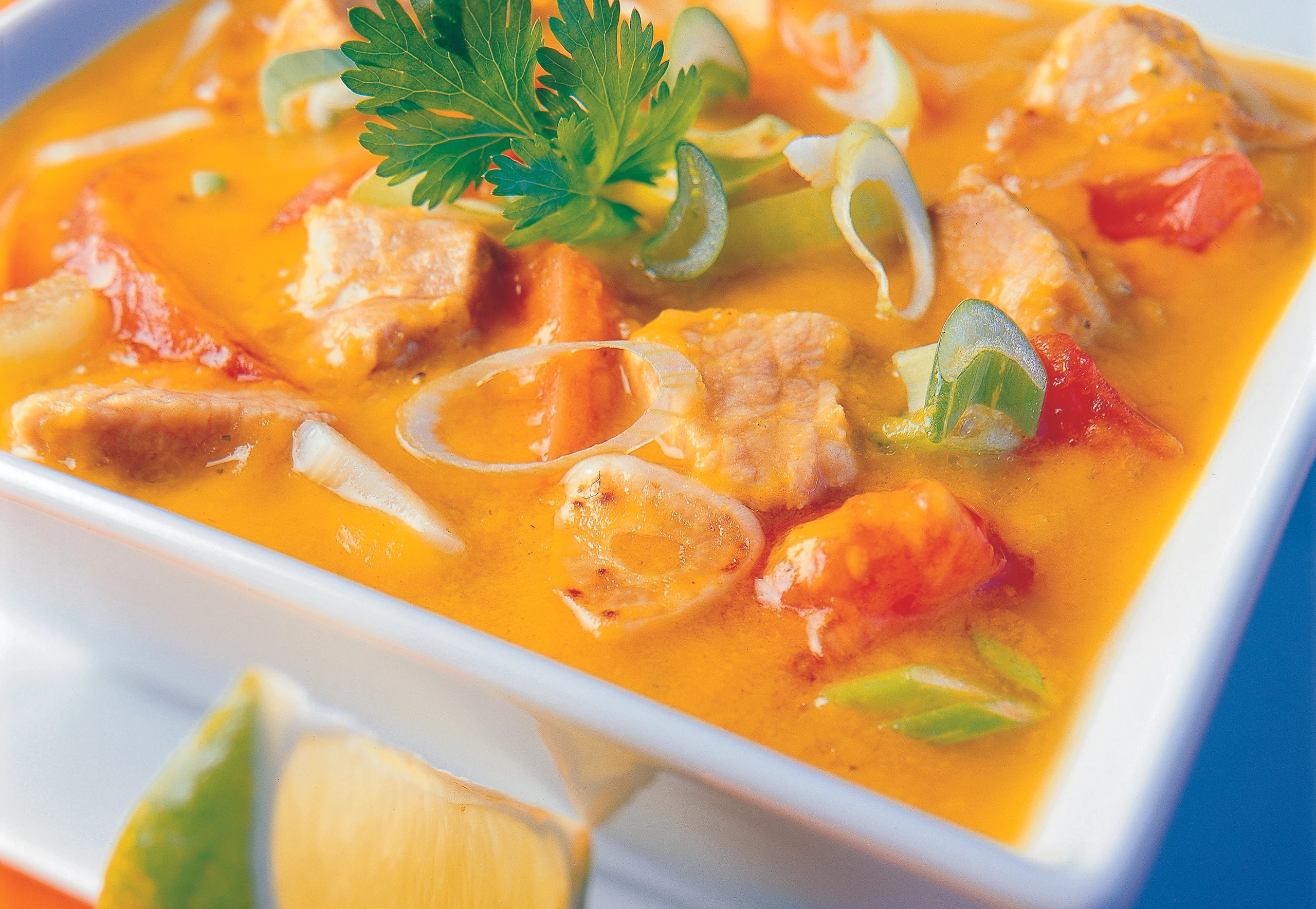 Fleisch zugeben und 10 Minuten kochen. Karotten, Petersilienwurzel, Sellerie, Tomate zugeben und ca. 8 Minuten kochen. Suppe mit Zitronensaft, Salz und Chili abschmecken, mit Koriander und Jungzwiebeln bestreuen.