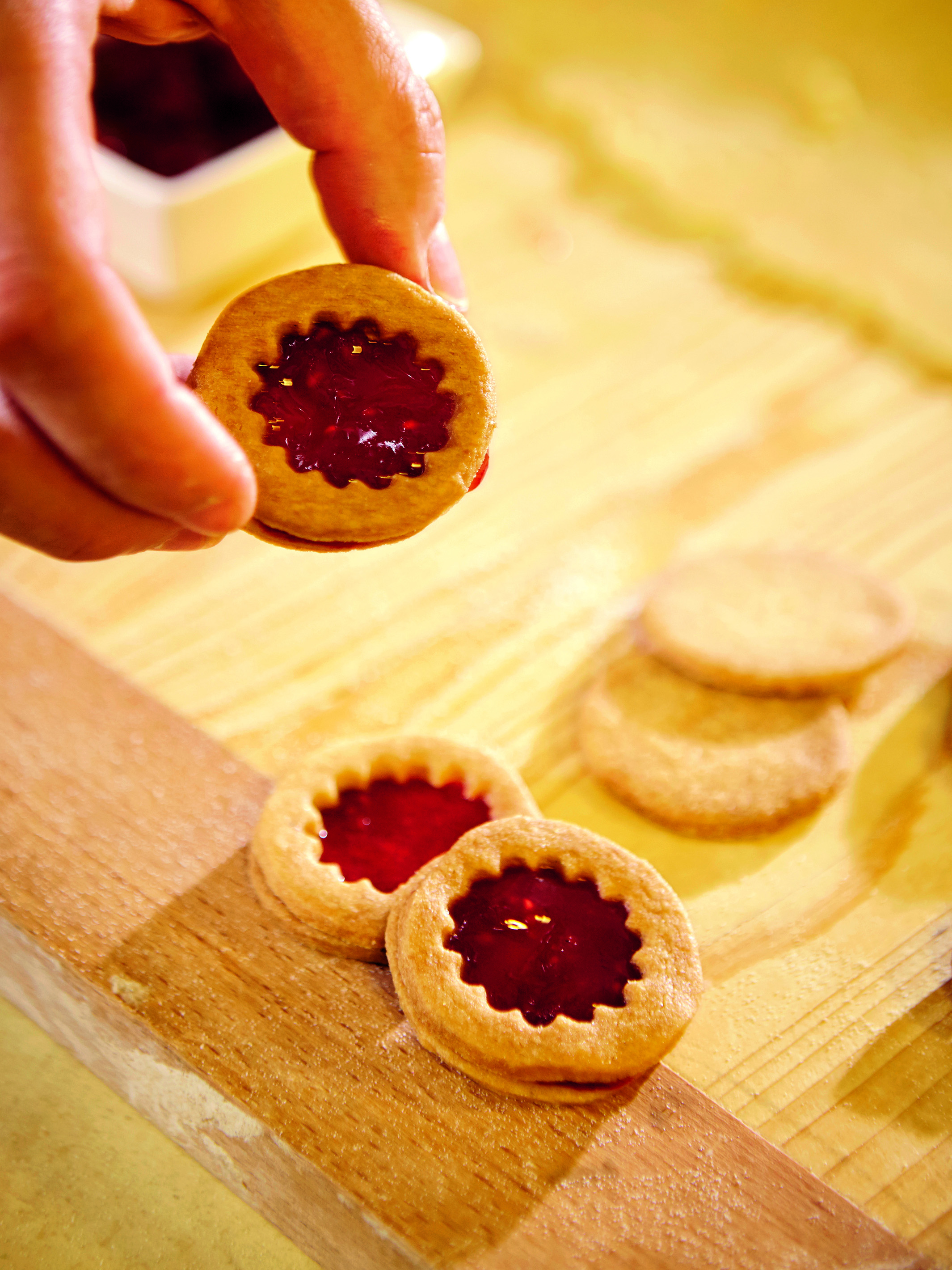 Teig auf einer bemehlten Arbeitsfläche ca. 2 mm dick ausrollen. Scheiben (Ø 4 cm) ausstechen, aus der Hälfte der Scheiben ein Loch ausstechen. Scheiben auf die Bleche legen und im Rohr (mittlere Schiene) hell backen (ca. 10 Minuten).