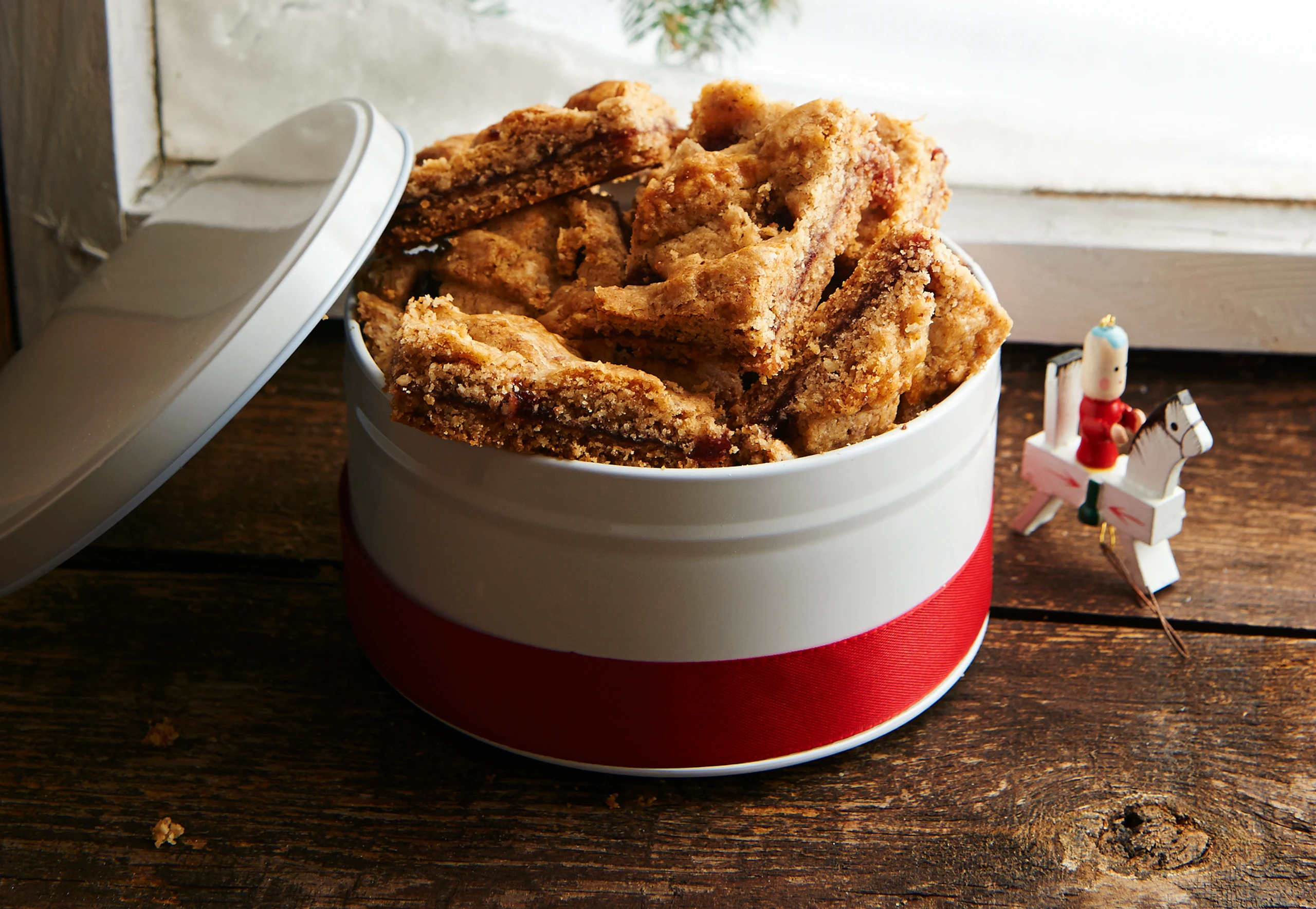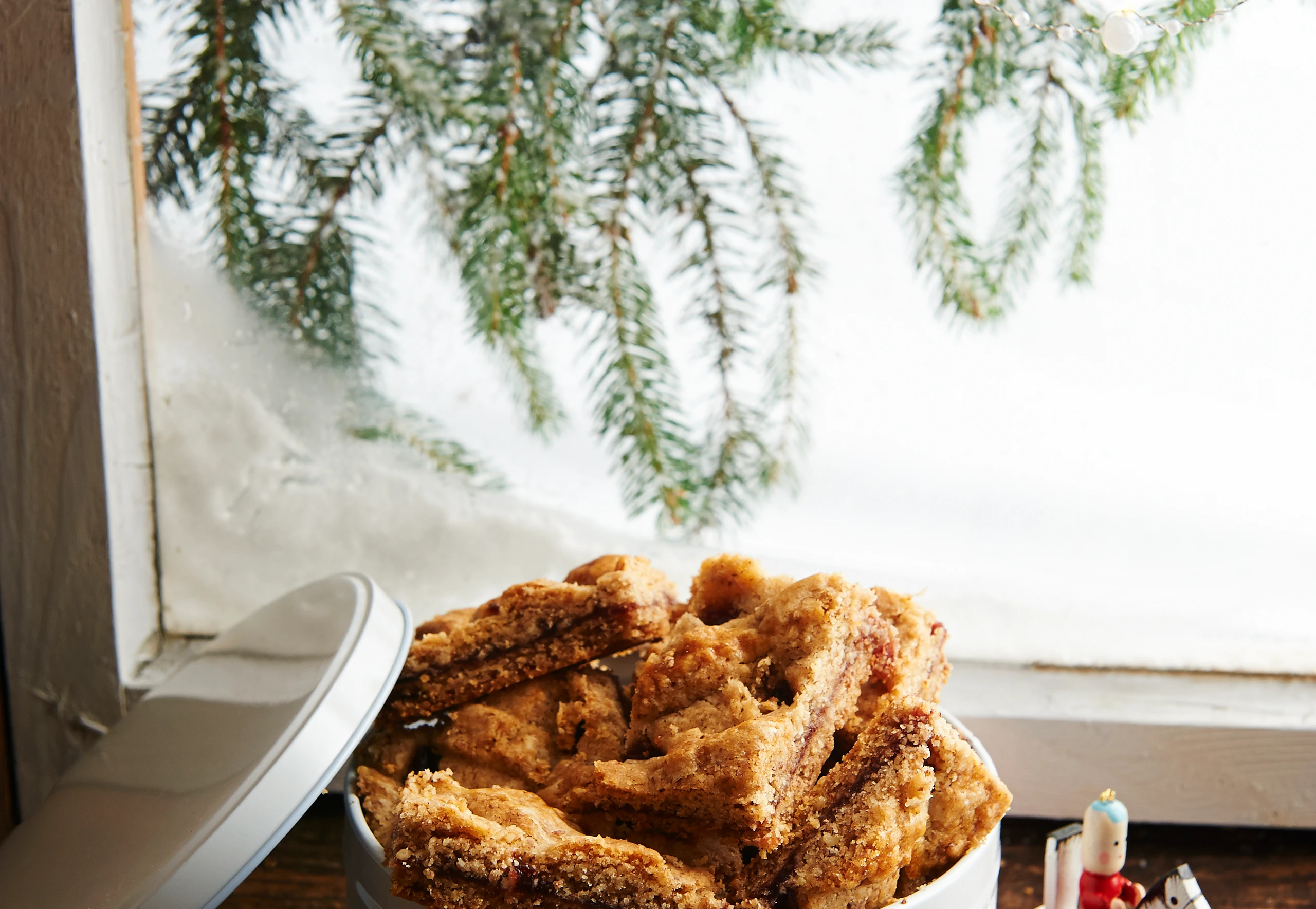 Zweite Teighälfte ausrollen, in Streifen schneiden und als Gitter auf die Marmelade legen.