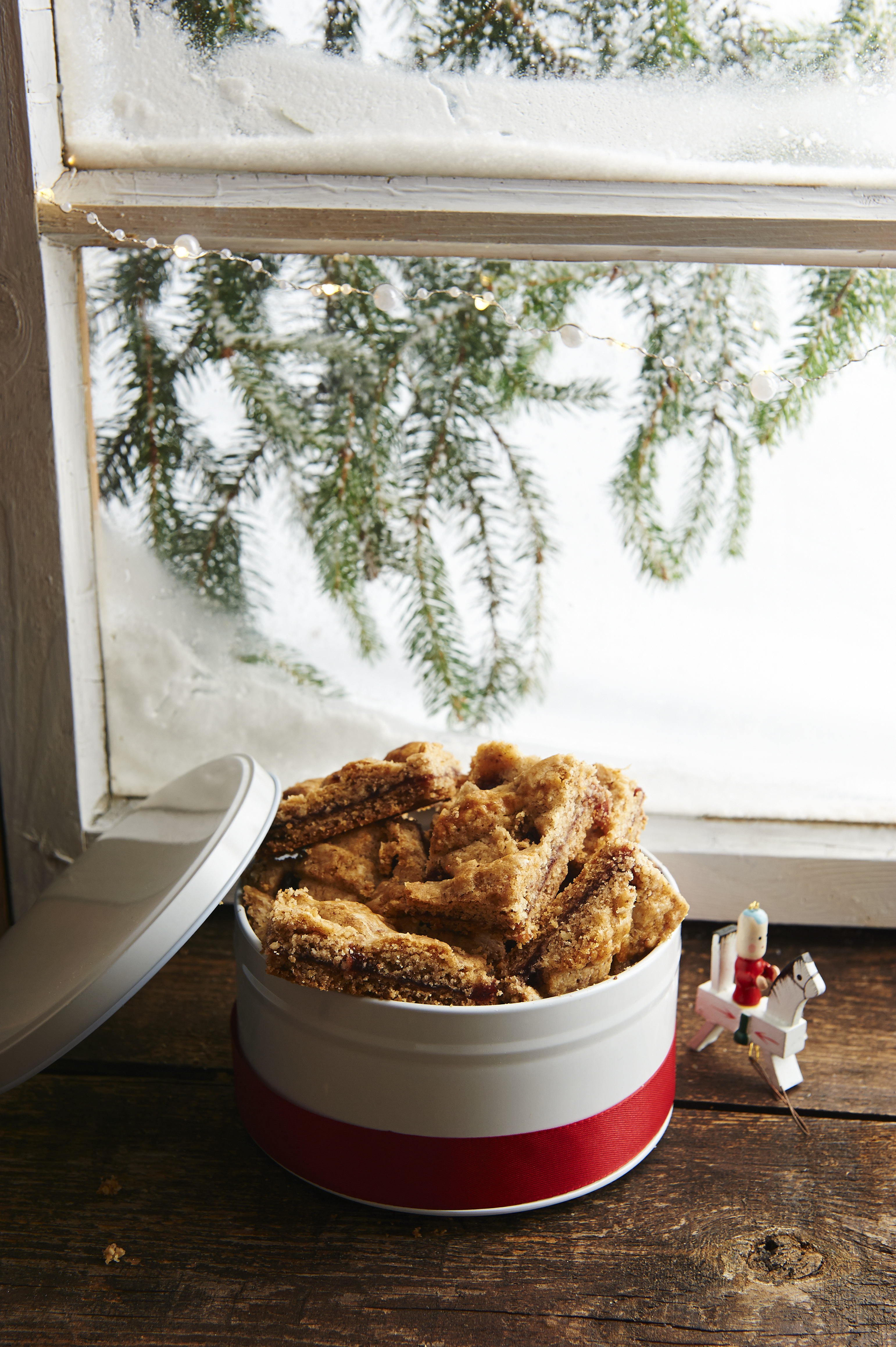 Teig halbieren. Eine Hälfte auf einer bemehlten Arbeitsfläche ausrollen. Mit der Rahmenform die Größe abmessen. Ausgerollten Teig in die Form auf das Blech legen und zuschneiden. Teig mit Eiklar bestreichen und die Ribiselmarmelade darauf verstreichen.