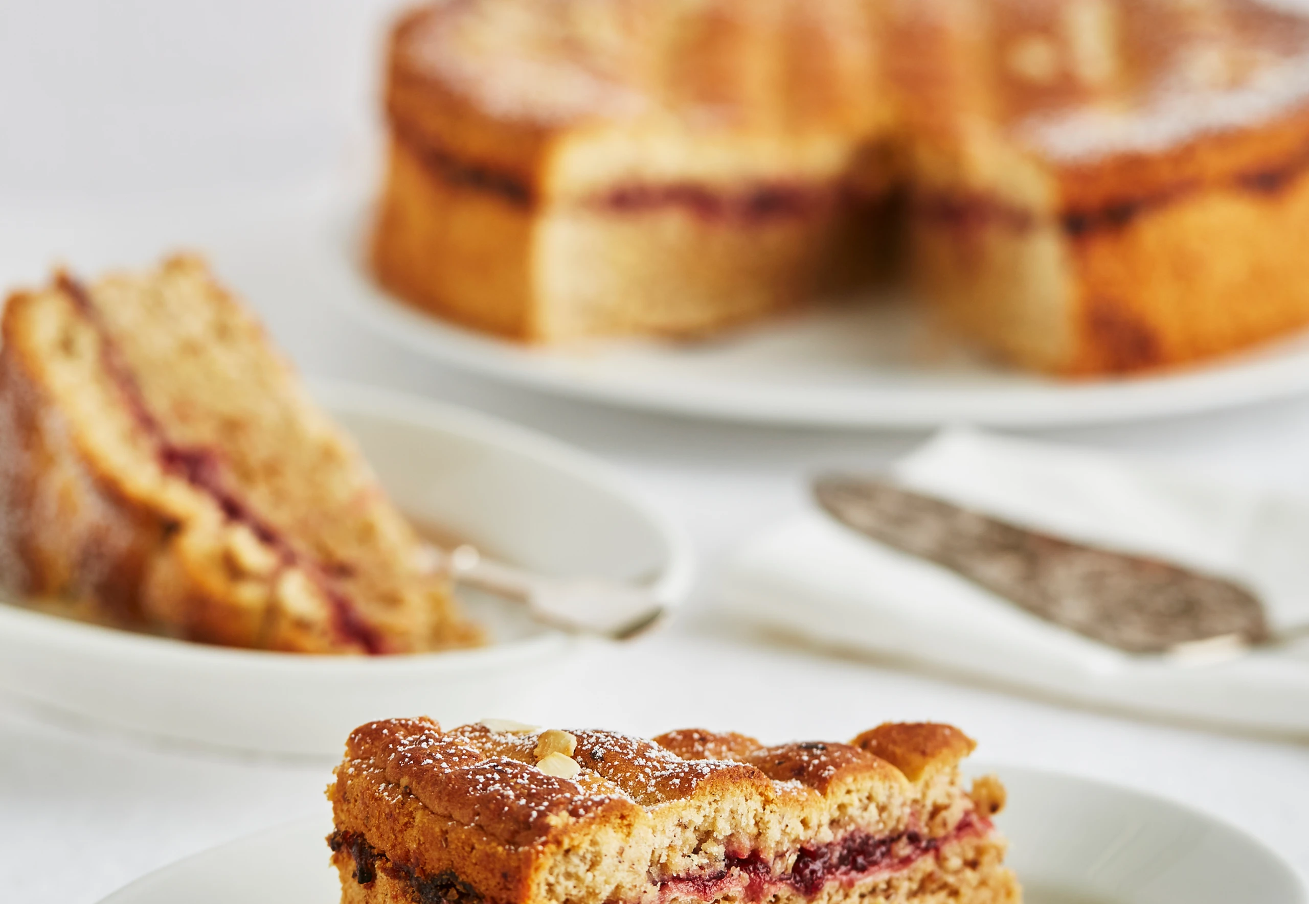 Zwei Drittel der Masse in die Form füllen, glatt streichen und mit Oblaten belegen. Ribiselmarmelade auf den Oblaten verstreichen.