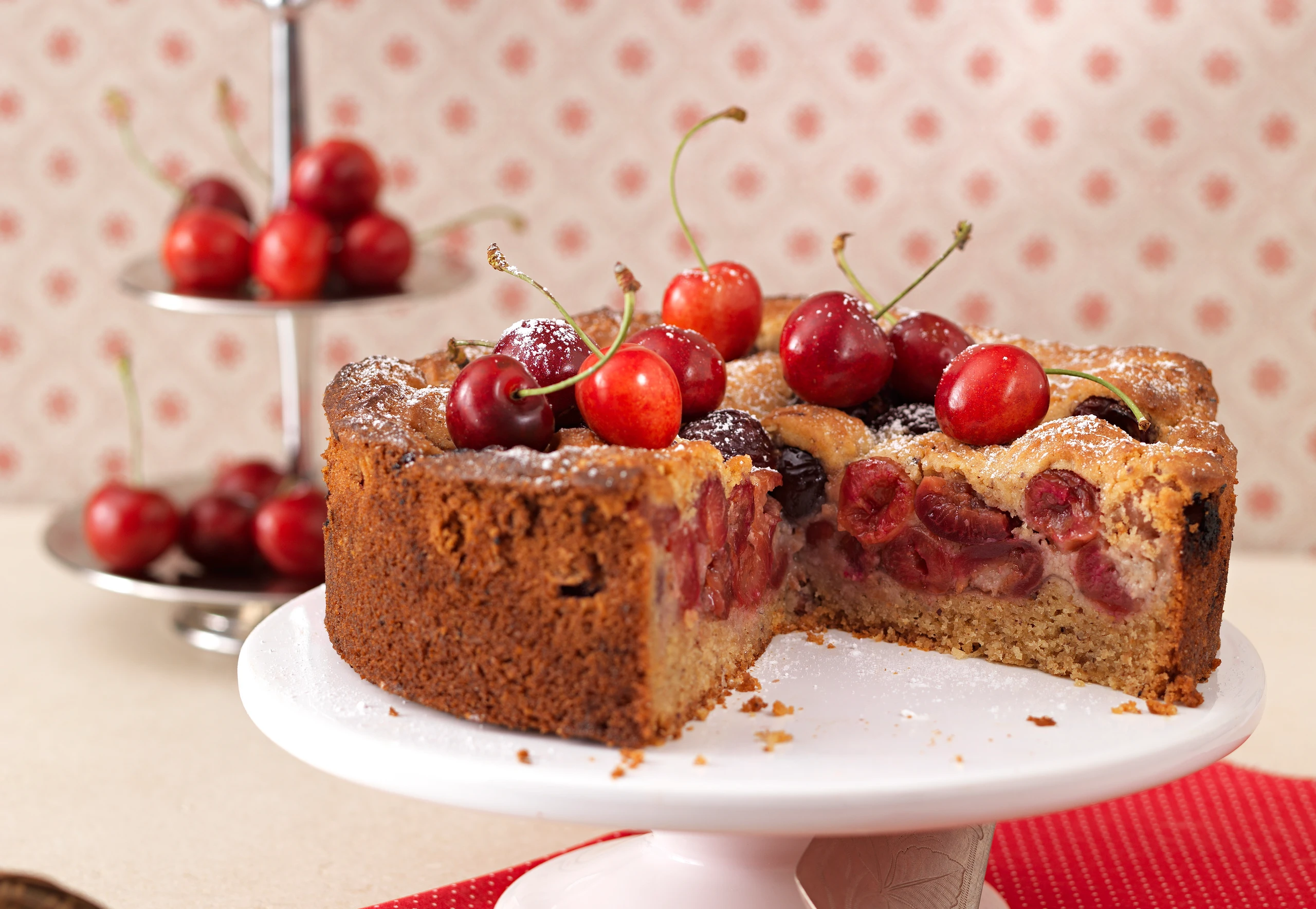 Restliche Masse in einen Dressiersack mit Sterntülle (Ø 5 mm) füllen und ein Gitter auf die Kirschen dressieren. Torte im Rohr (mittlere Schiene / Gitterrost) ca. 70 Minuten backen. Herausnehmen und mit Staubzucker bestreuen. Eventuell mit Kirschen garnieren.