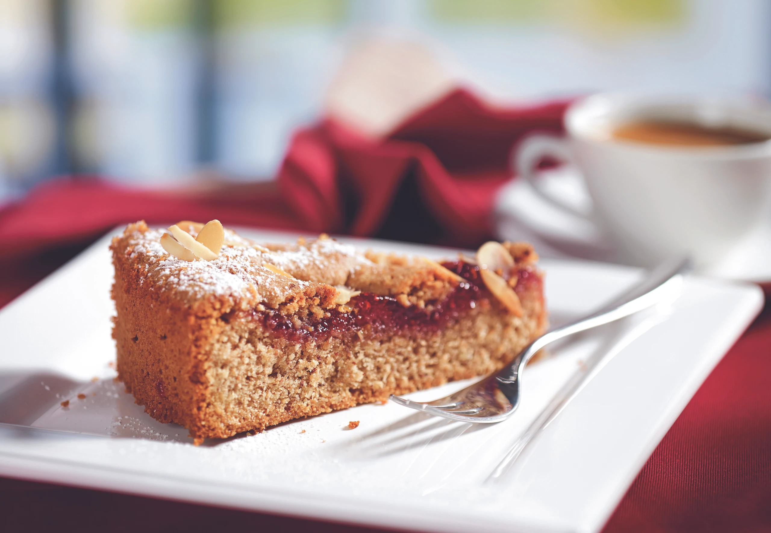 Übrigen Teig in einen Dressiersack mit Sterntülle füllen. Zuerst einen Rand, dann ein Gitter auf die Torte dressieren. Torte mit Mandeln bestreuen und im Rohr (untere Schiene / Gitterrost) ca. 50 Minuten backen.