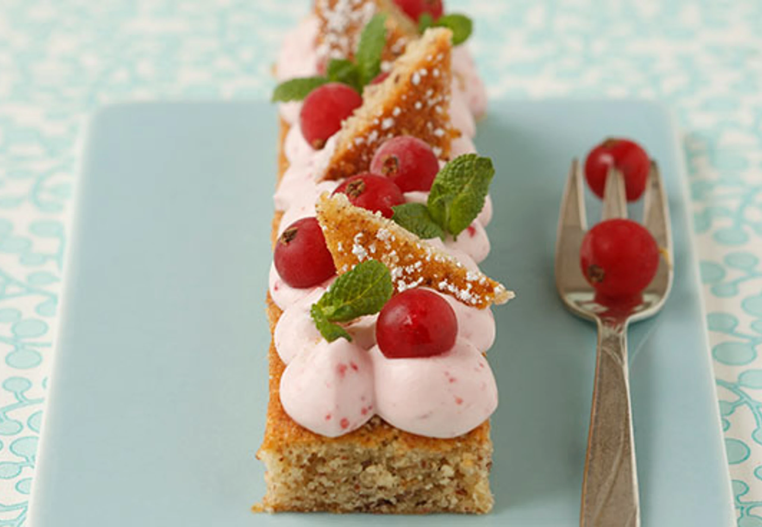 - Ribiselcreme in einen Dressiersack (glatte Tülle) füllen und in Form von kleinen Punkten auf die Teigstücke dressieren. Schnitten mit Ribiseln, Kuchen-Dreiecken und Minze garniert servieren.