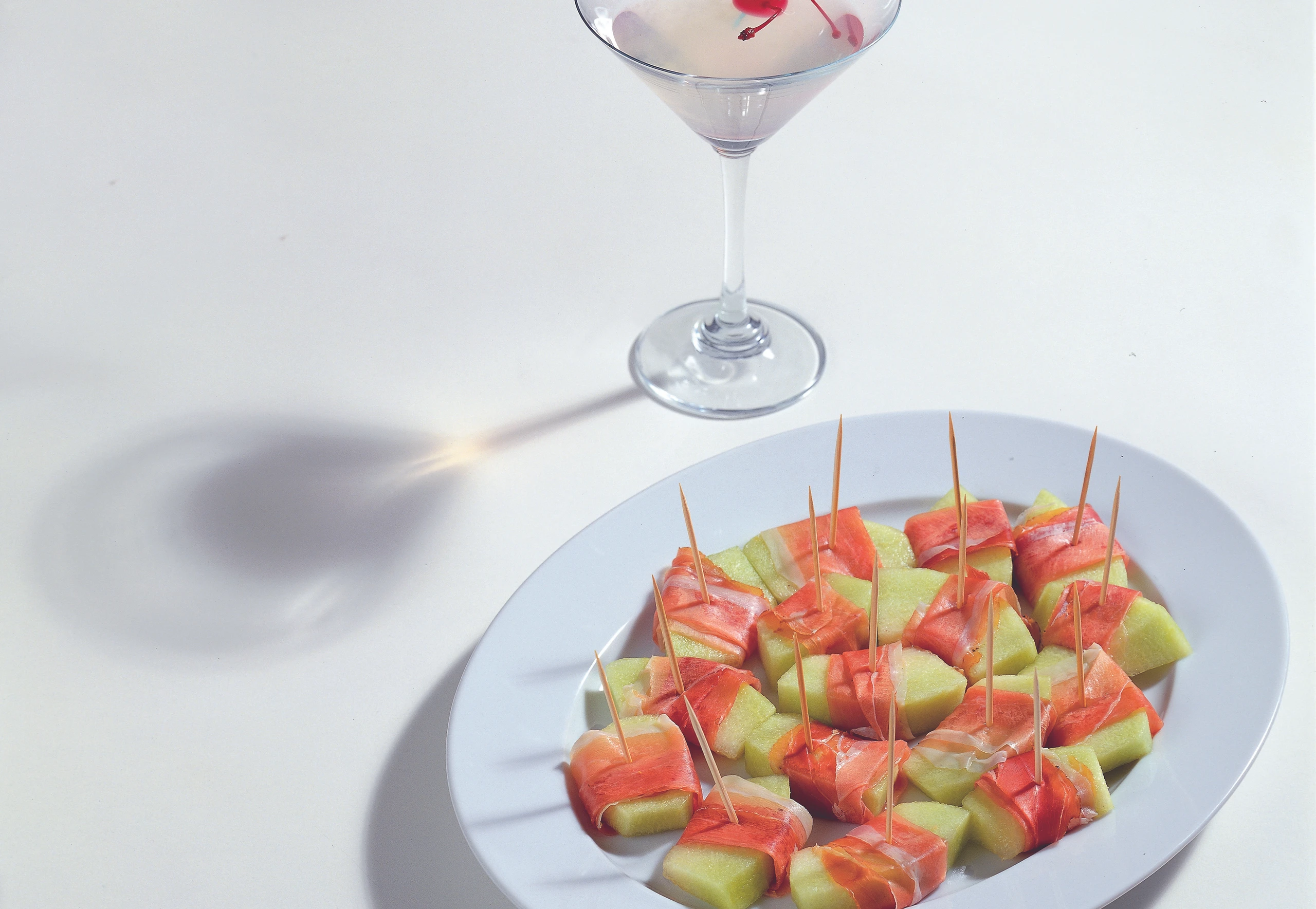 Cocktailgläser vorbereiten. Je 3 Kirschen auf 4 kleine Spieße stecken.