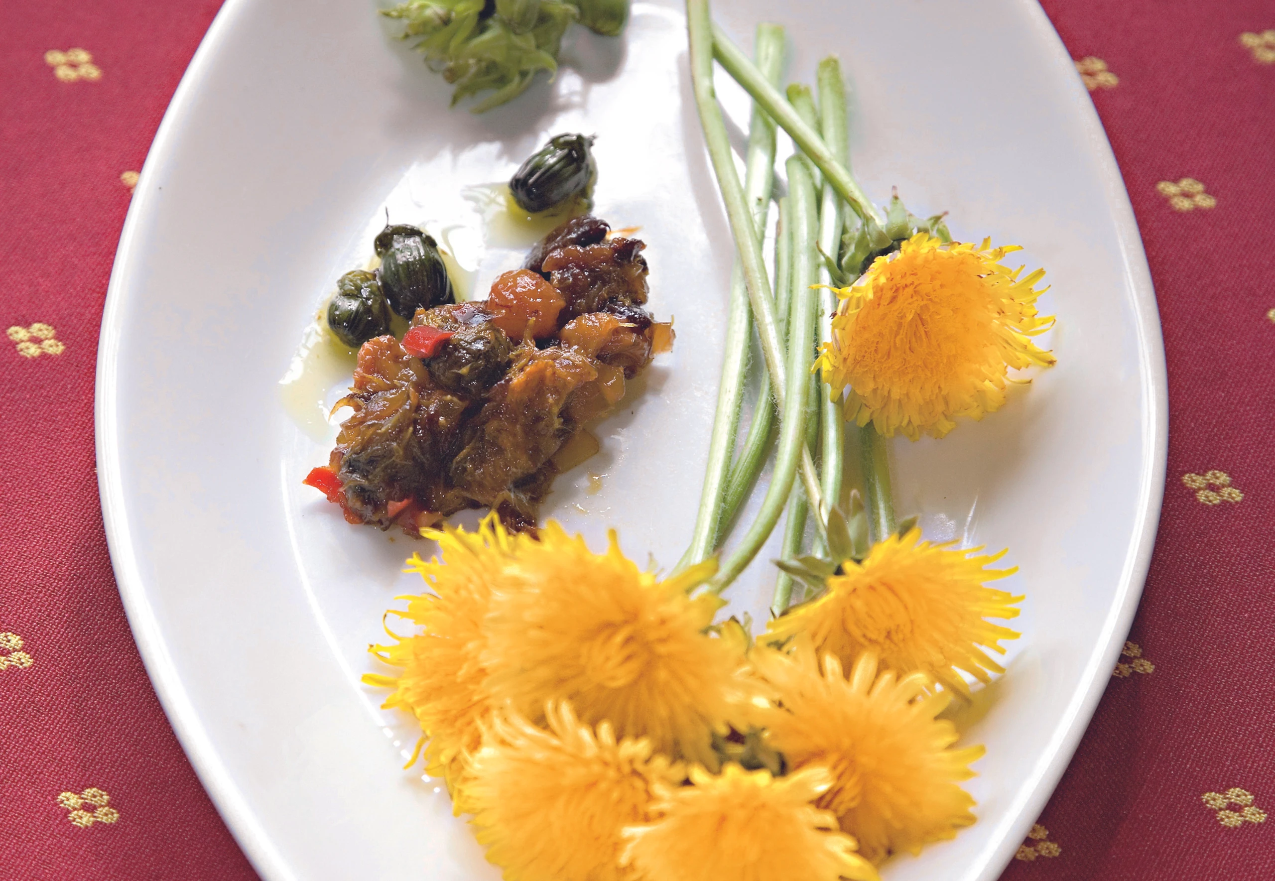 Früchte und Gemüse in gleichmäßig kleine Würfel schneiden und in einen weiten Topf geben. Löwenzahnblüten und alle übrigen Zutaten zugeben und 2 Tage ziehen lassen.