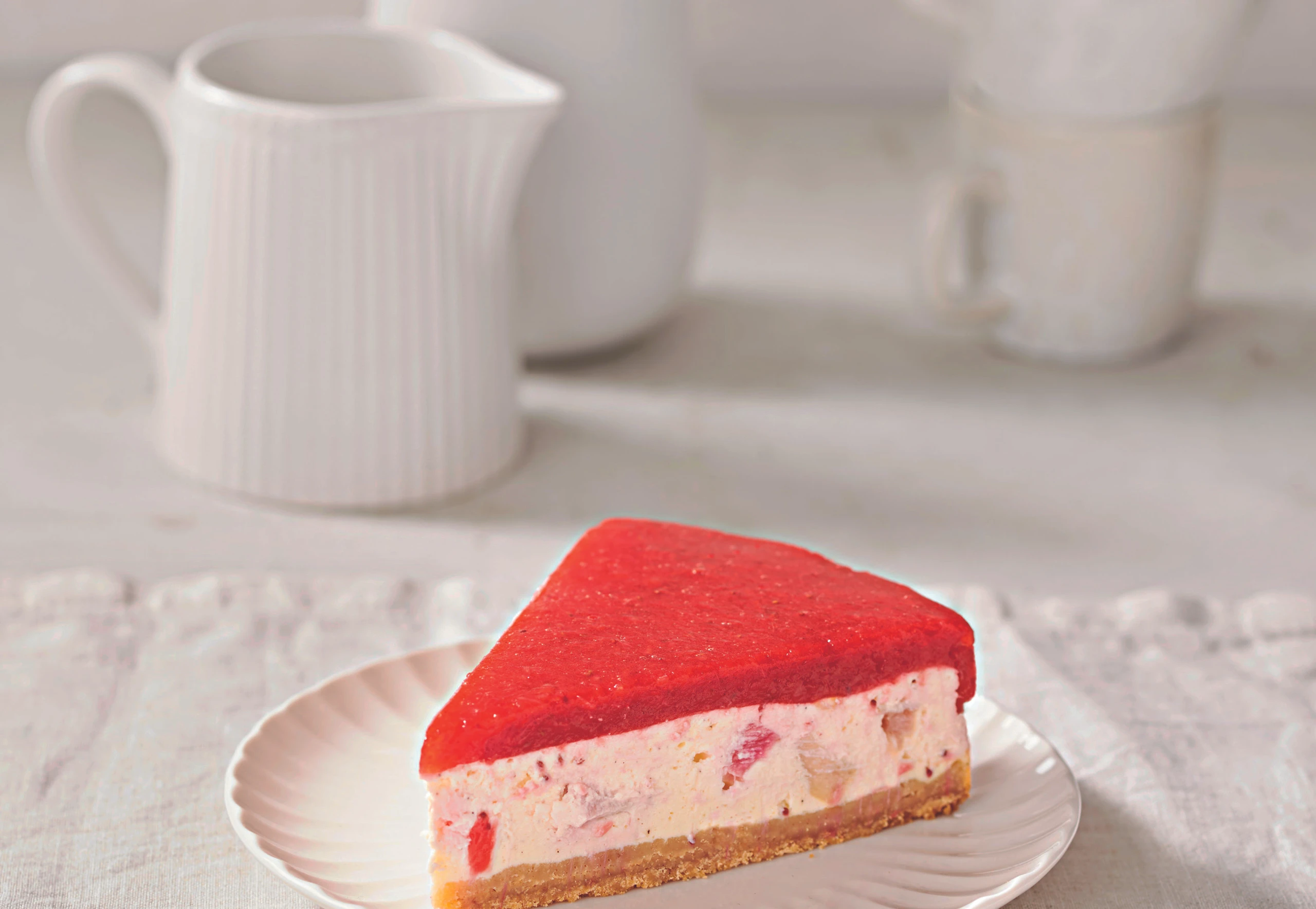 Erdbeerpüree ca. 20 Minuten auskühlen lassen. Gelatine ausdrücken und untermischen. Fruchtspiegel auf dem Kuchen verstreichen und für mind. 4 Stunden kühl stellen.