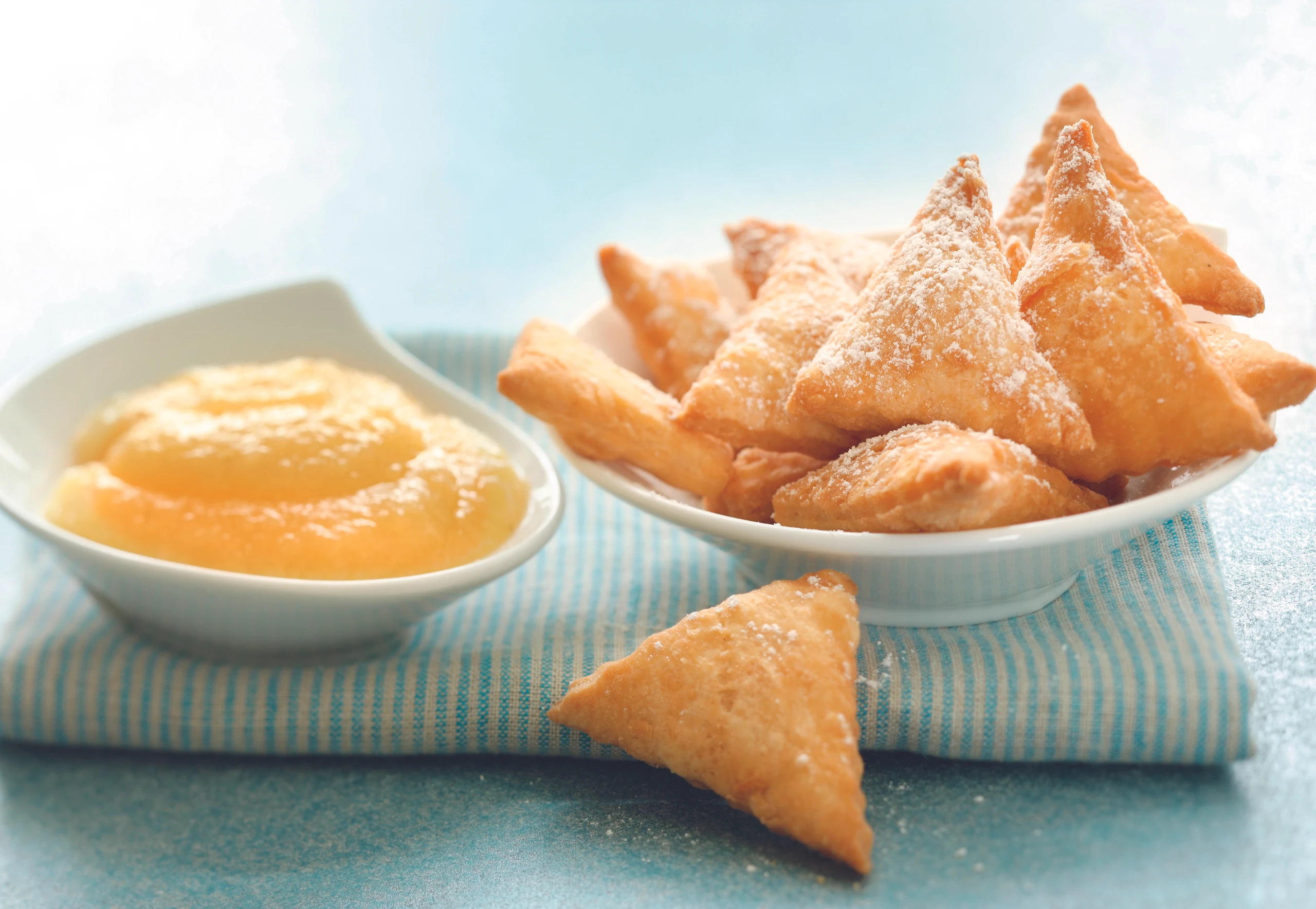 Ca. 3 Finger hoch Öl erhitzen. Teig auf einer bemehlten Arbeitsfläche ca. 0,5 cm dick ausrollen, mit einem Teigrad Dreiecke (Kantenlänge 3 cm) ausradeln und im heißen Öl schwimmend goldgelb backen.