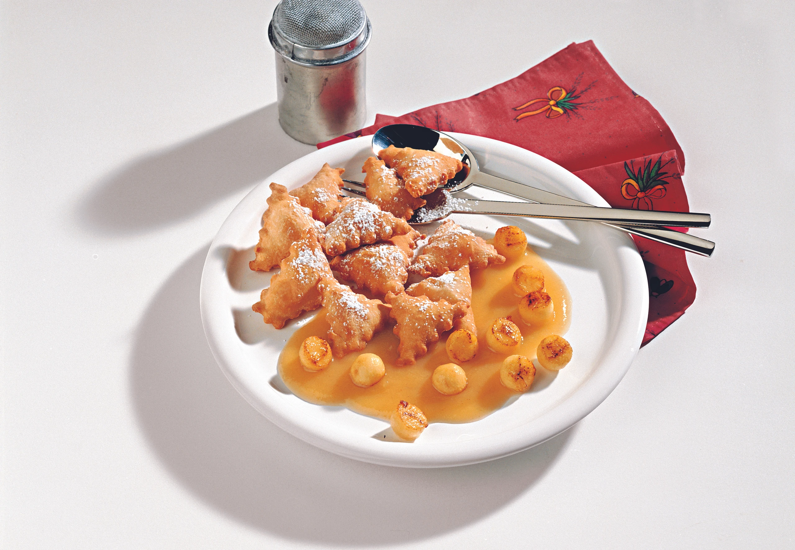 Drei Finger hoch Öl erhitzen. Teig auf einer bemehlten Arbeitsfläche ca. 0,5 cm dick ausrollen, mit einem Teigrad Dreiecke ausradeln und im heißen Fett schwimmend goldgelb backen.