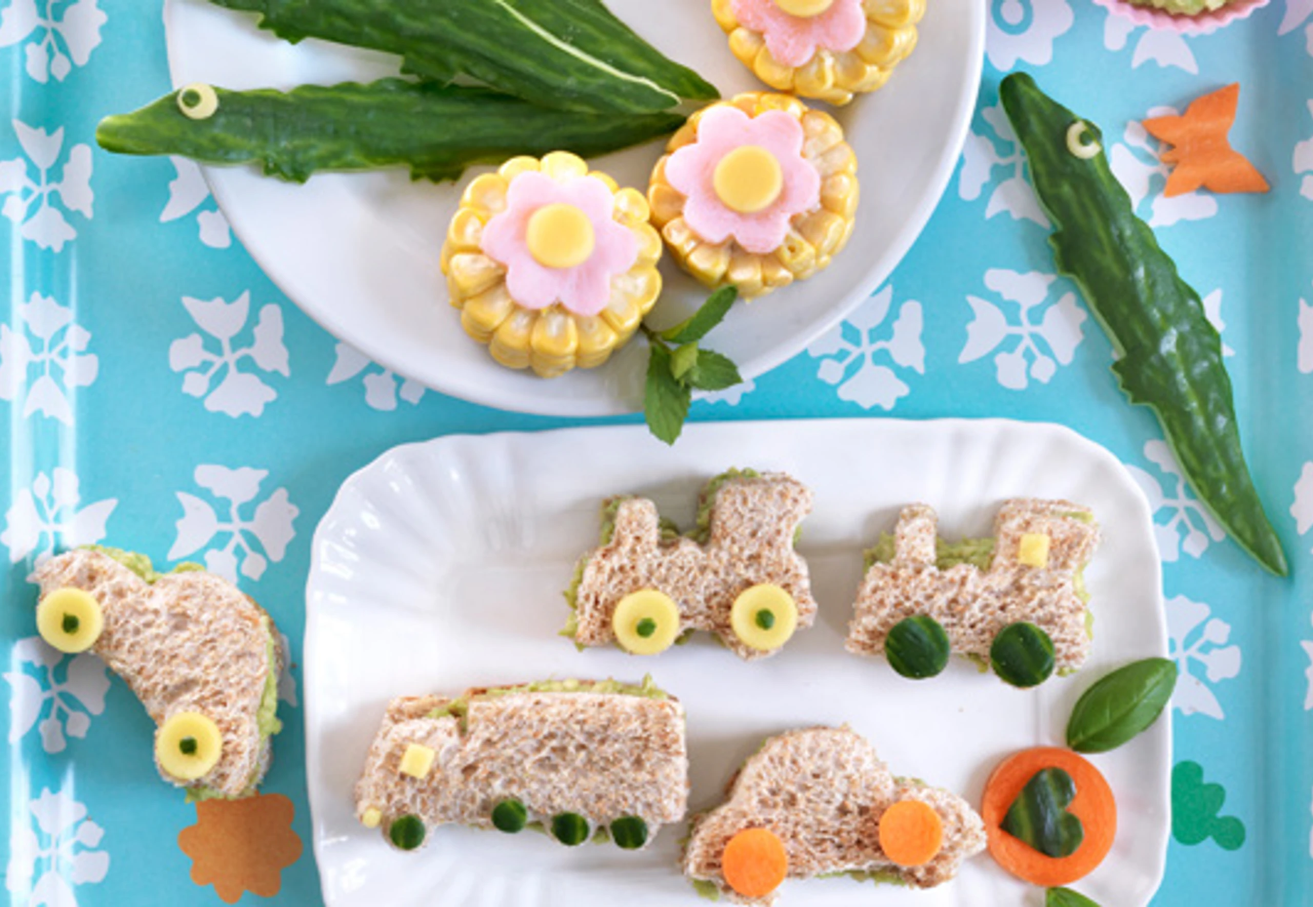 - Für die Krokodile Gurke waschen, breite Längsstreifen abschneiden. Daraus Krokodile ausstechen, diese mit Augen aus Käse und einer Pupille aus Gurkenschale dekorieren.