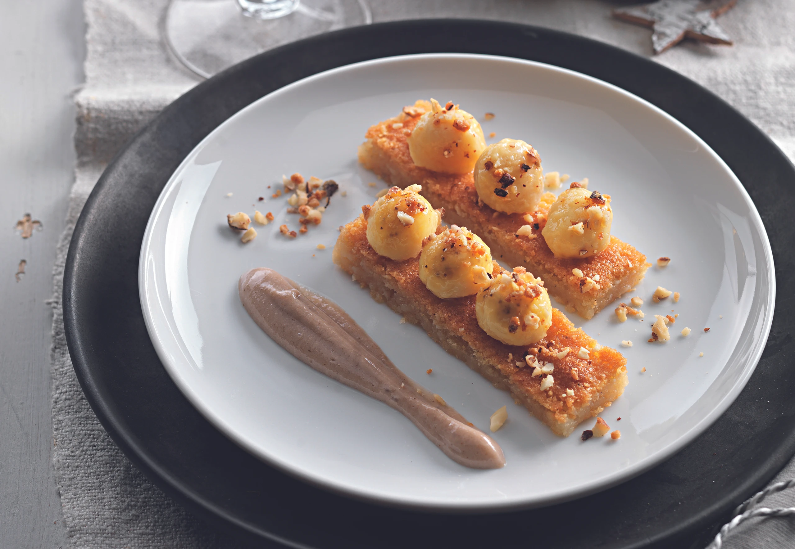Kuchen in 16 Rechtecke (2 x 7 cm) schneiden, mit Bananenkugeln garnieren, mit Streusel und Sauce anrichten.