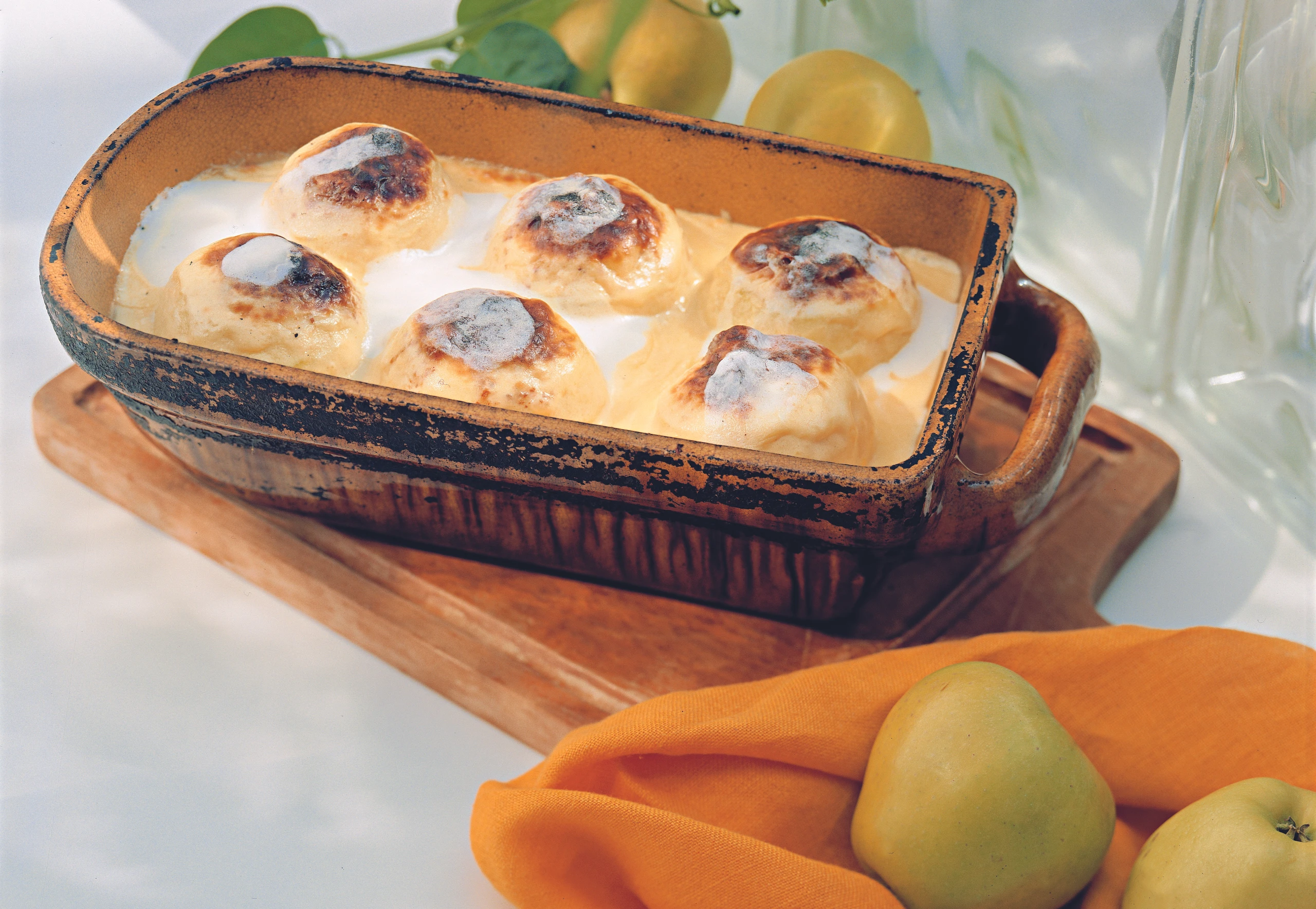 Die Äpfel mit Vanillecreme übergießen und im vorgeheizten Rohr (unterste Schiene / Gitterrost) ca. 45 Minuten goldbraun backen.