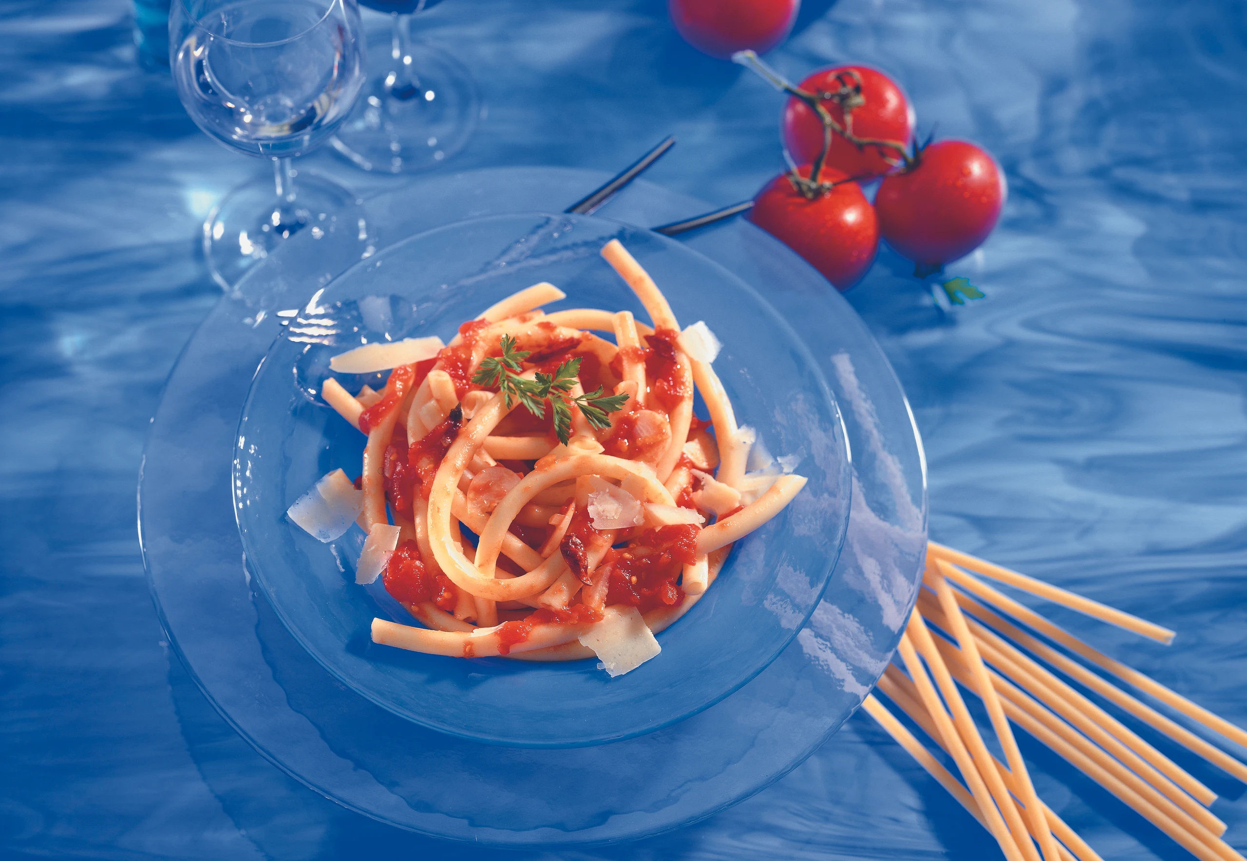 - In einer großen Pfanne Speck in Öl anbraten, Zwiebel, Knoblauch und Chili zugeben und mitrösten. Mit Wein ablöschen, Paradeiser samt Saft zugeben. Paradeiserstücke mit einer Gabel zerdrücken und ein wenig einkochen lassen. Sauce mit Salz, Pfeffer und Cayennepfeffer würzen.