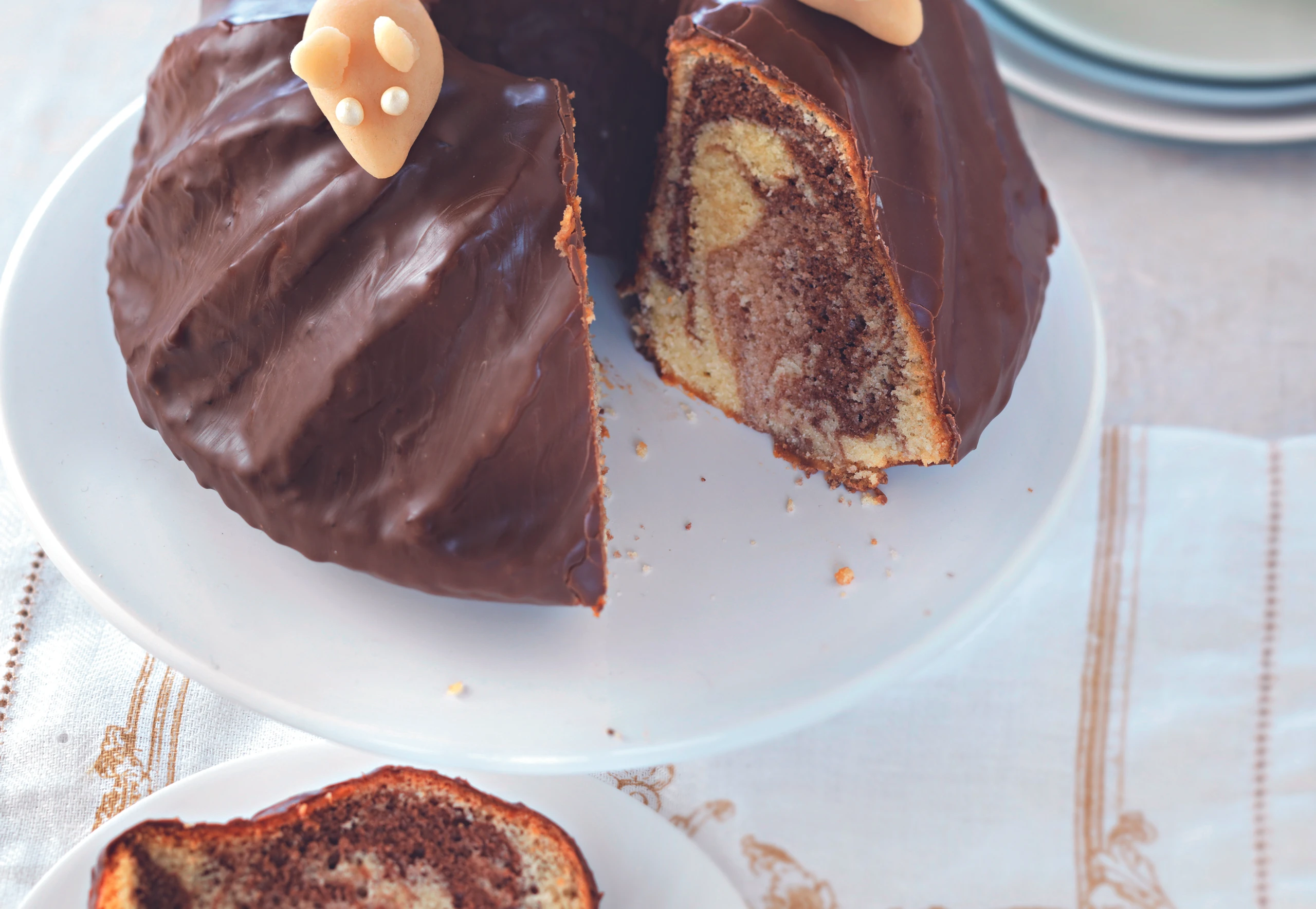 Ein Drittel von der Masse mit Kakao einfärben. Helle und dunkle Masse abwechselnd in die Form füllen. Mit einer Gabel oder einem Spieß Kreise in die Kuchenmasse ziehen. Gugelhupf im Rohr (untere Schiene / Gitterrost) ca. 45 Minuten backen. Gugelhupf aus dem Rohr nehmen, aus der Form stürzen und auskühlen lassen.