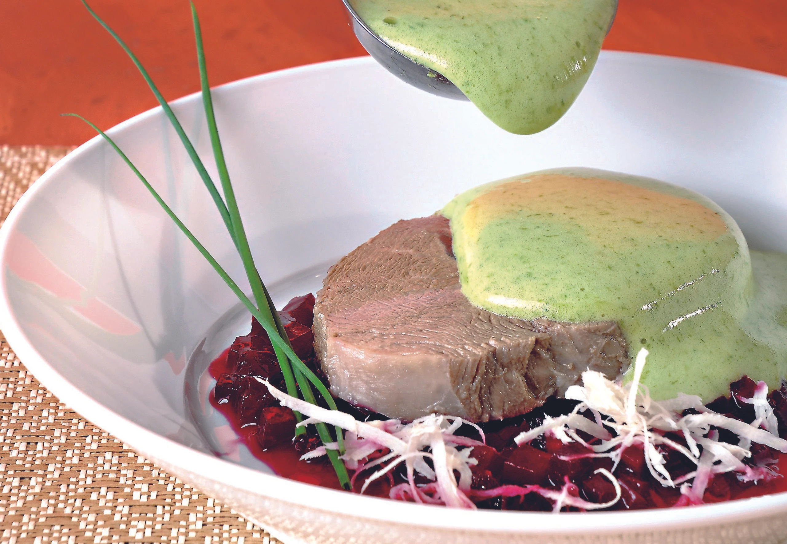Mageres Meisel mit Schnittlauchsabayon auf Roten Rüben