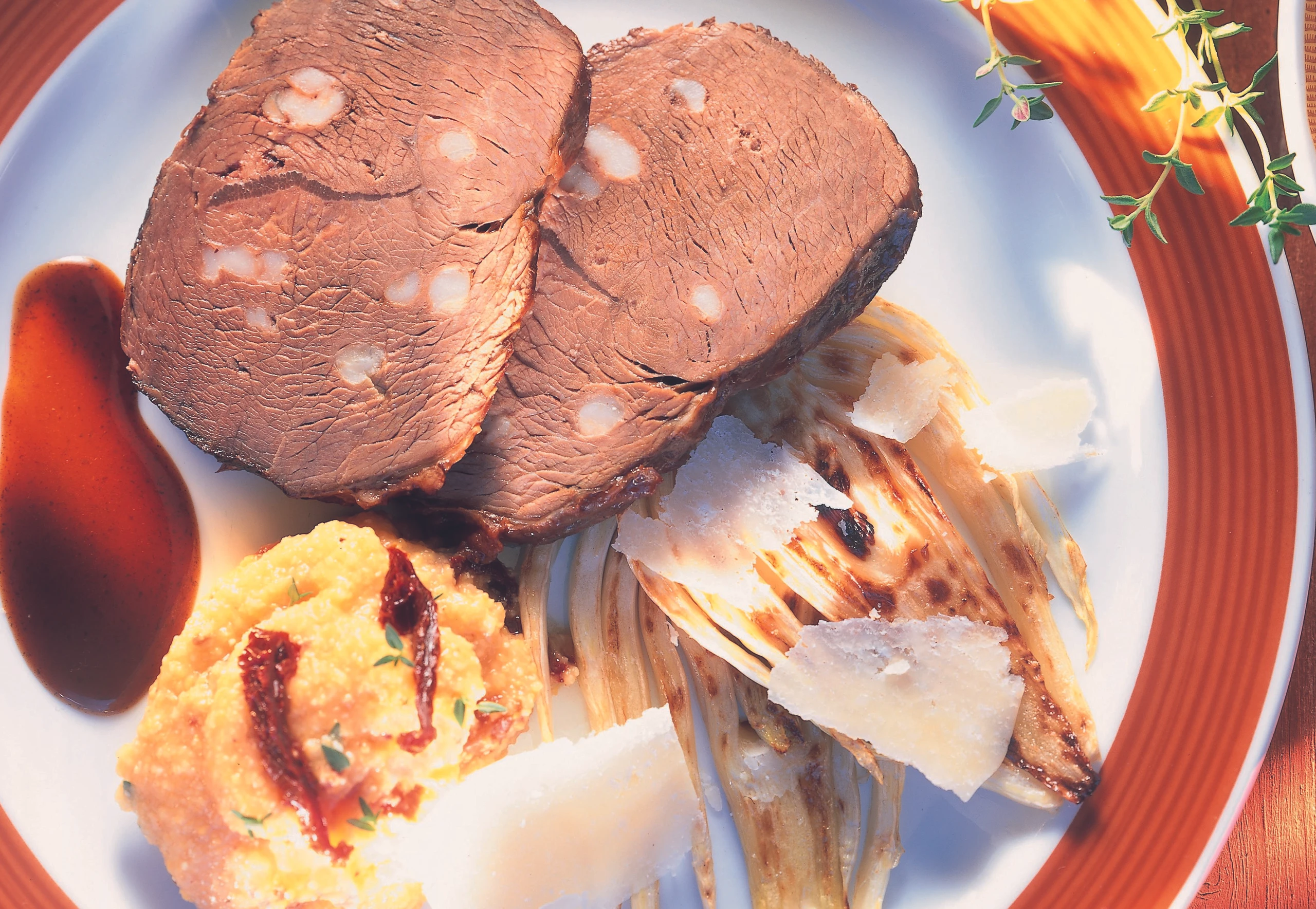 Mageres Meisel mit Rotweinsauce und Paradeis-Polenta