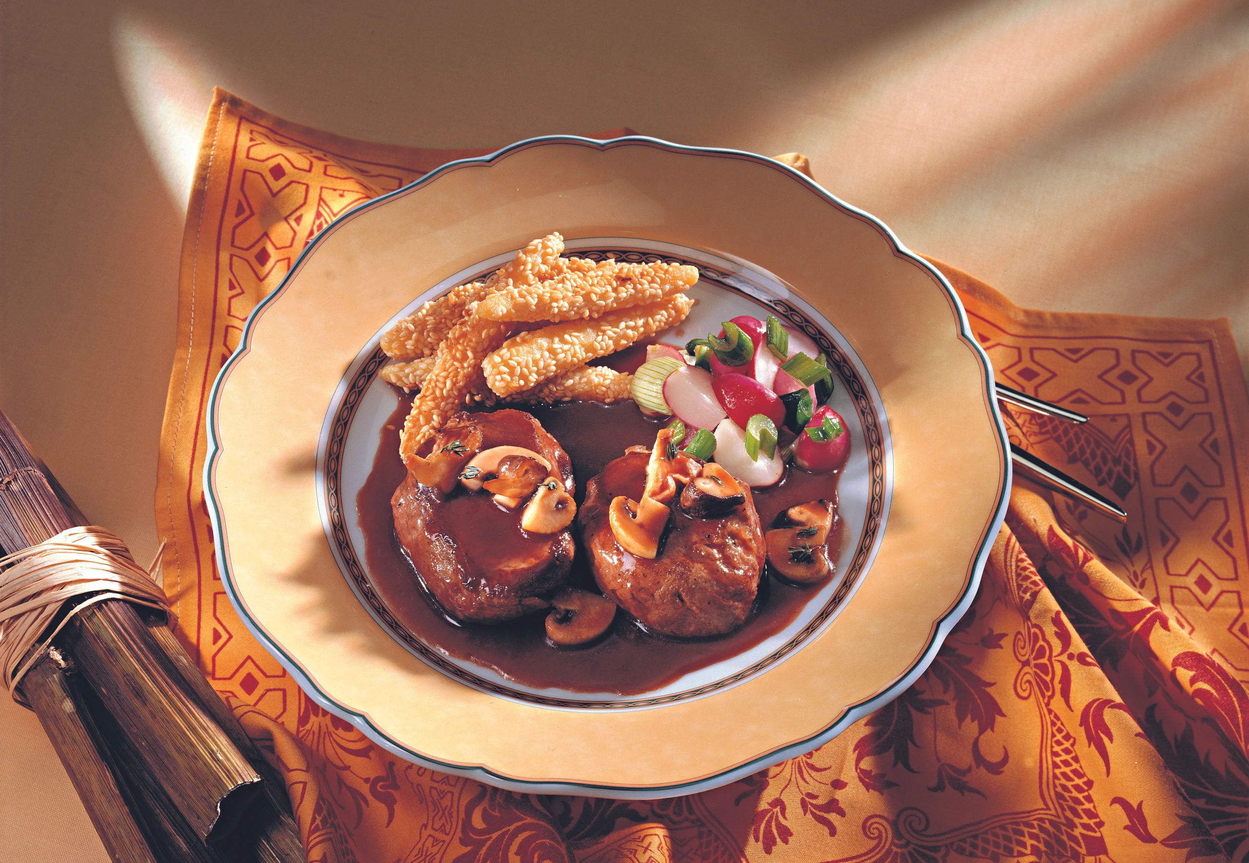 - Sauce mit Salz, Pfeffer und Thymian würzen. Medaillons hineinlegen (ausgetretenen Fleischsaft zugießen), wenden und kurz ziehen lassen. Fleisch mit der Sauce und mit den Beilagen anrichten.