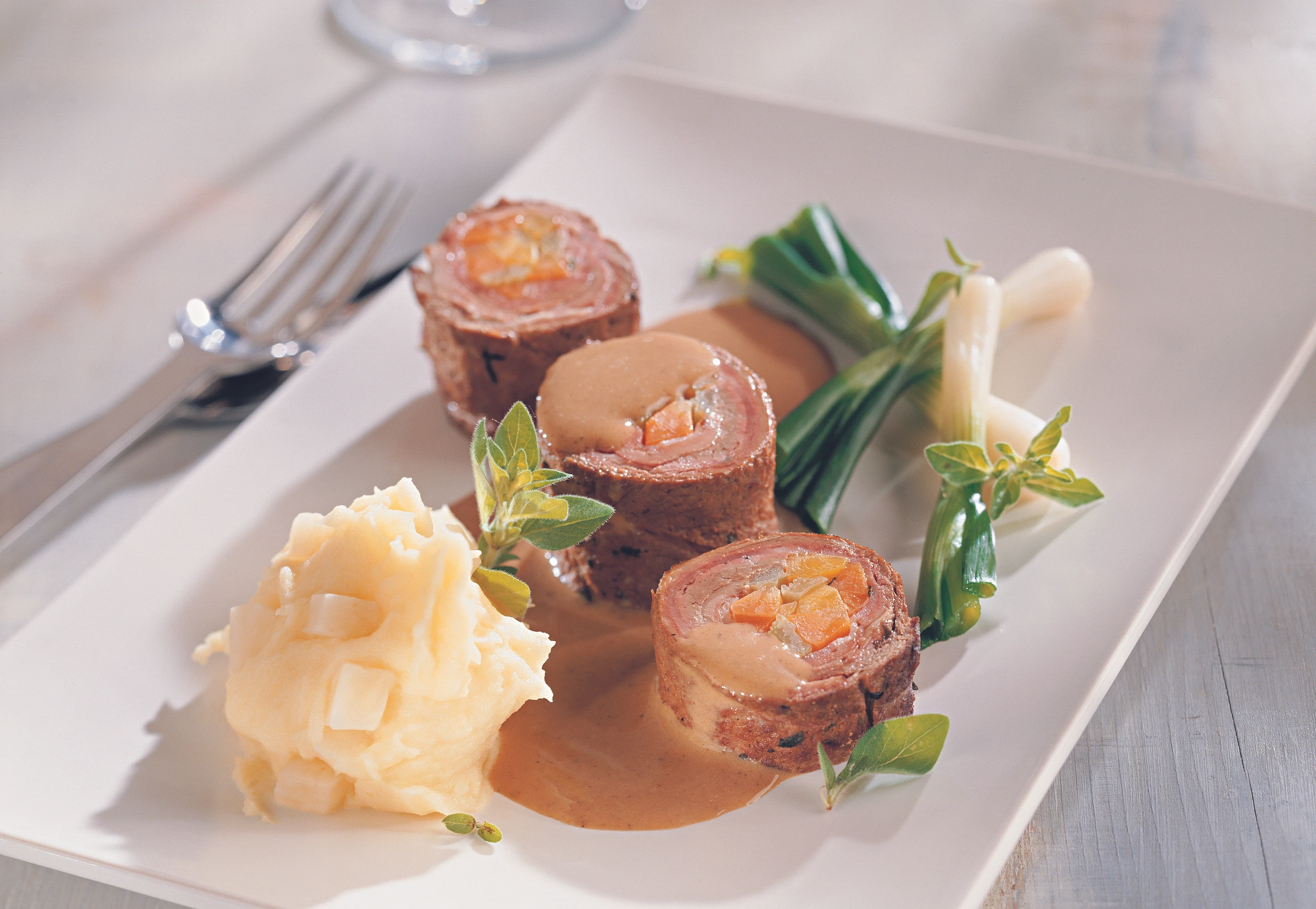 Maibock-Röllchen mit Sellerie-Erdäpfelmus