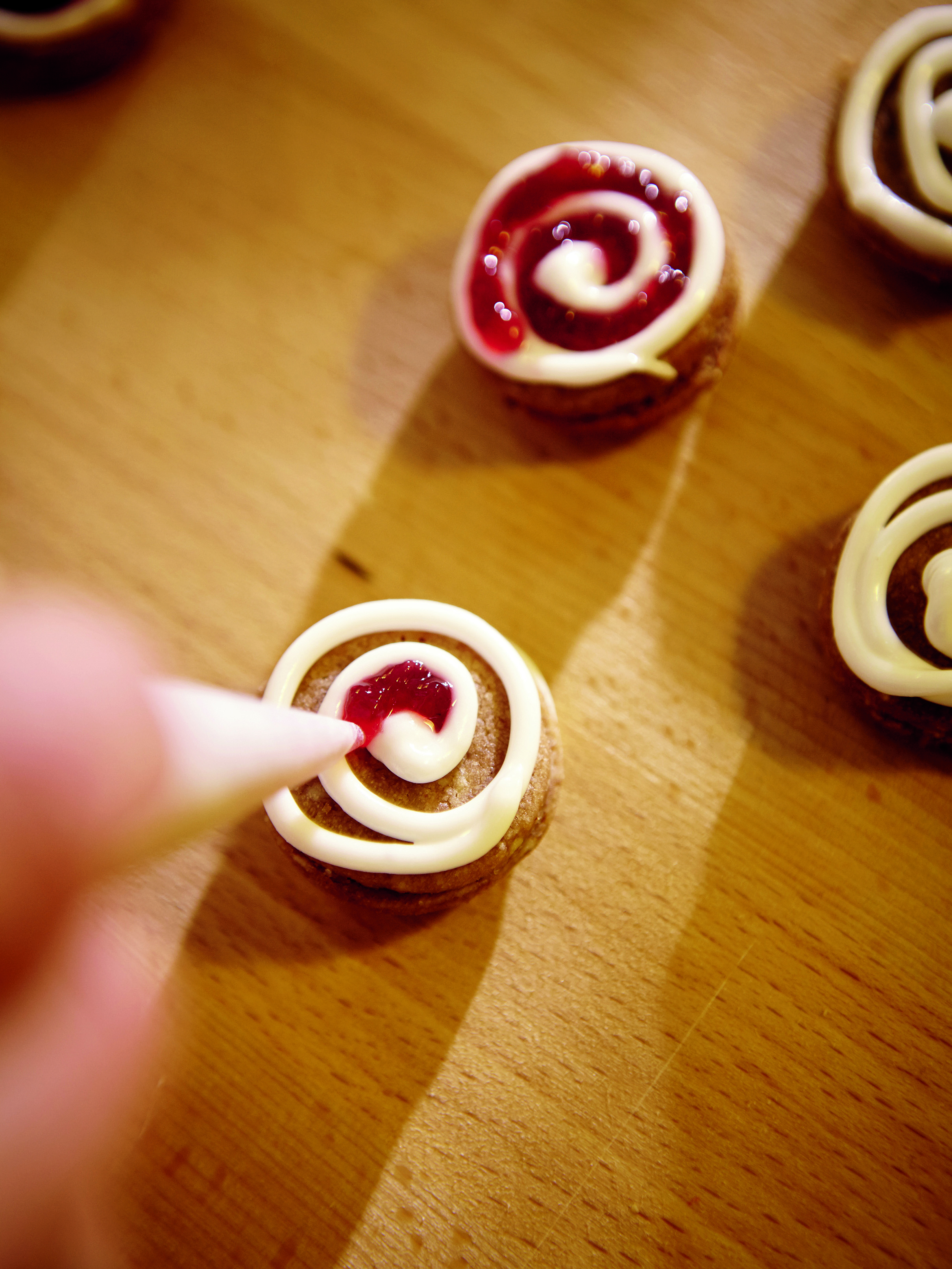 Für die Garnitur Eiklar halbfest anschlagen, Staubzucker zugeben und zu festem Schnee schlagen. Schnee in ein Papierstanitzel füllen und Spiralen auf die Kekse dressieren. Glasur trocknen lassen.