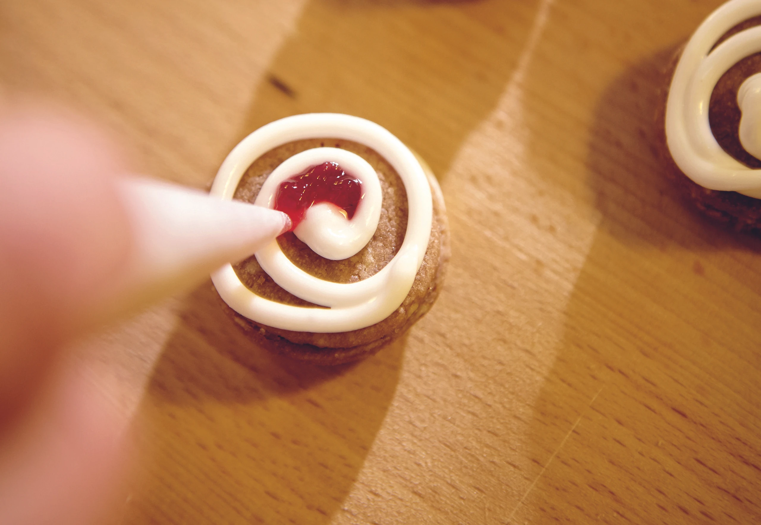 Jeweils zwei Kekse mit Ribiselmarmelade zusammensetzen.