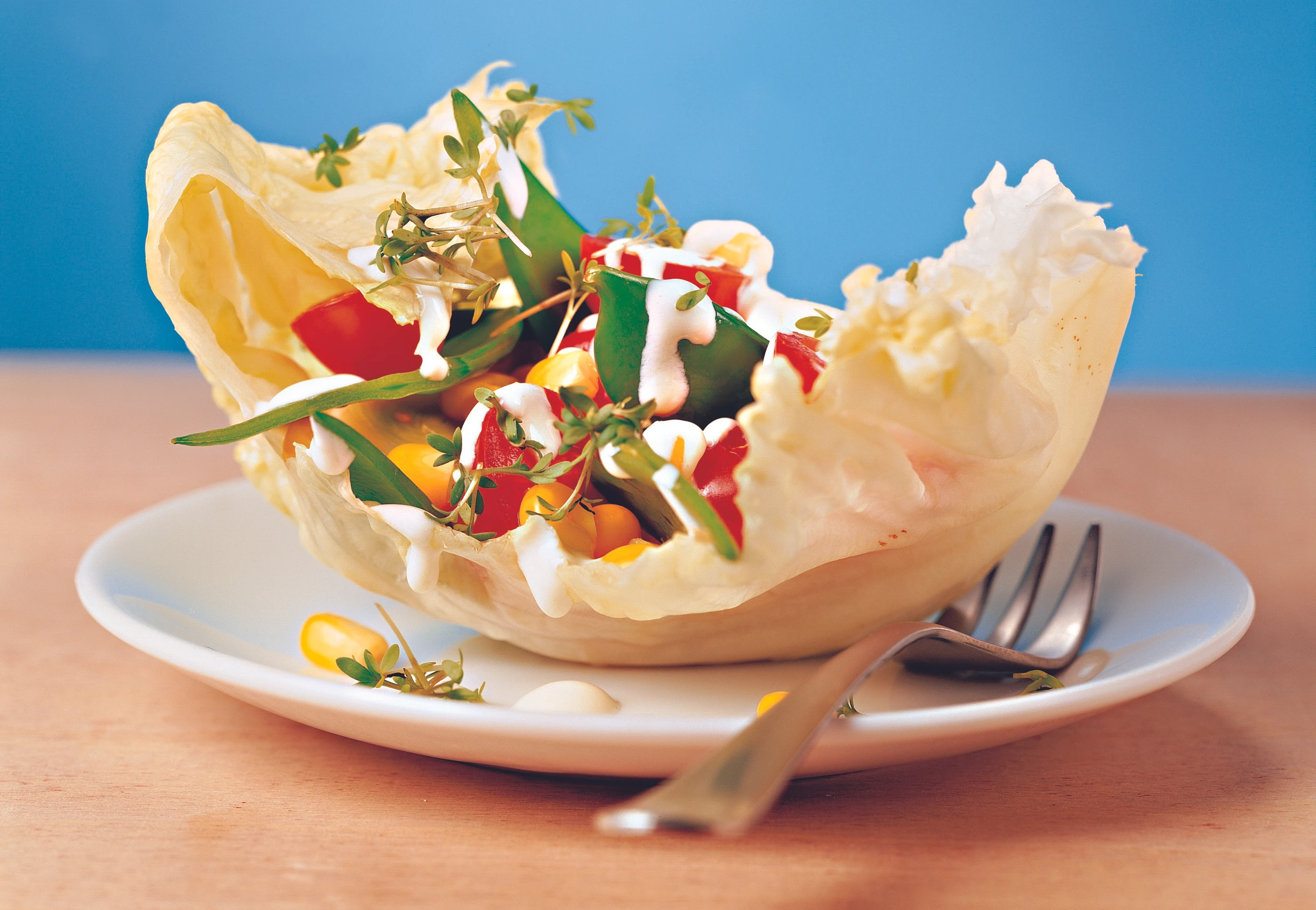 | 4 Stk. | Salatblätter (am besten Eisberg) |