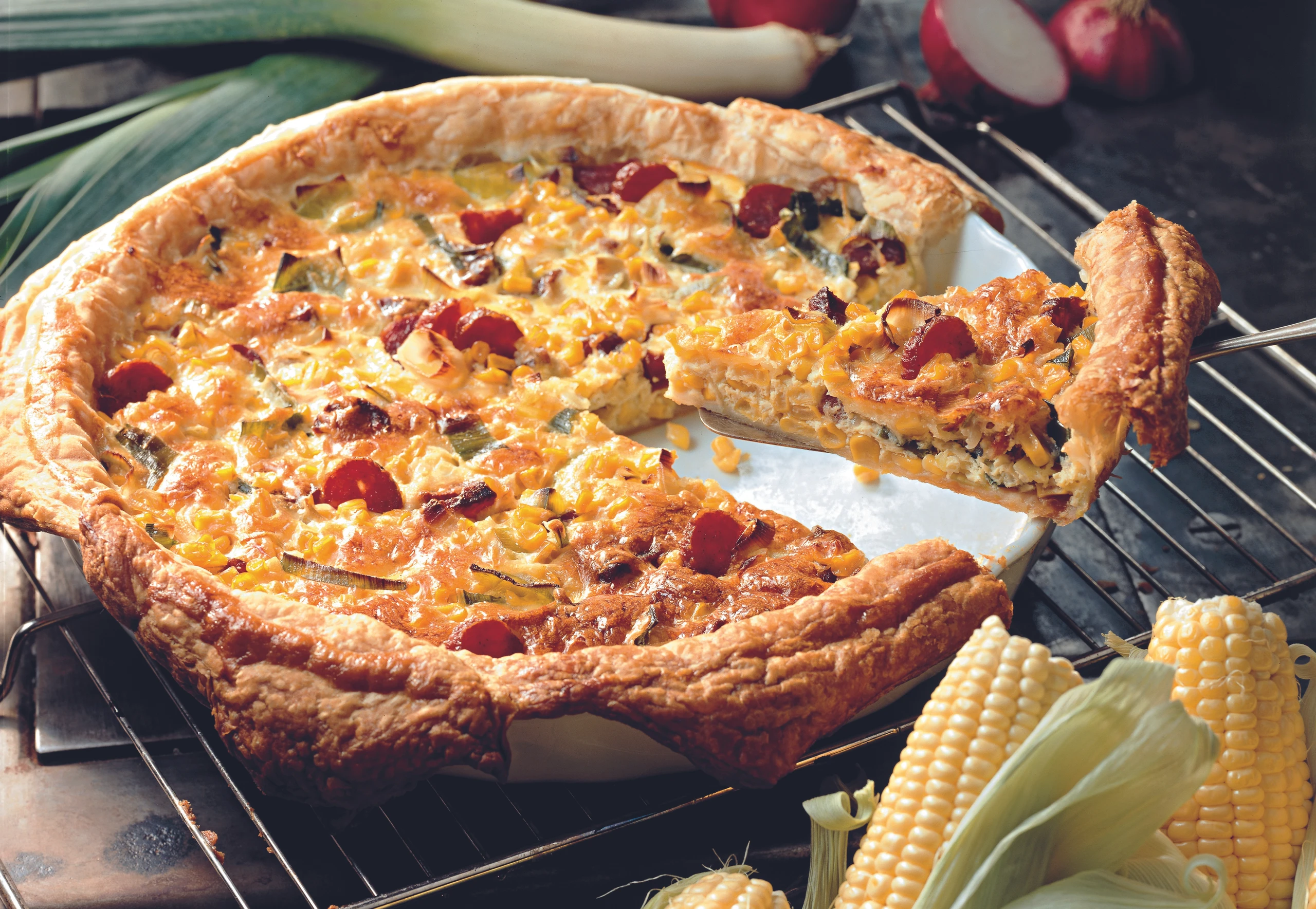 Mais-Quiche mit Lauch und Knoblauchwurst