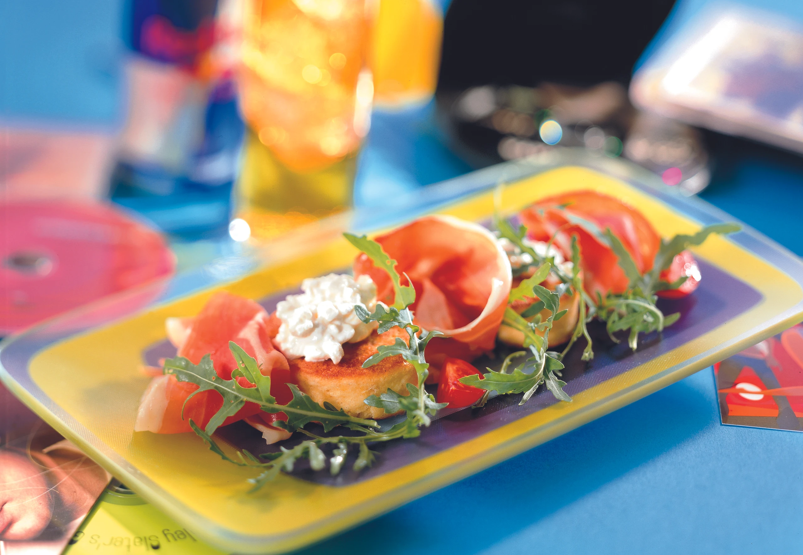 Rucola und Tomaten mit der Marinade vermischen. Maisblinis mit Ricotta und Prosciutto garnieren, mit Rucolasalat anrichten.