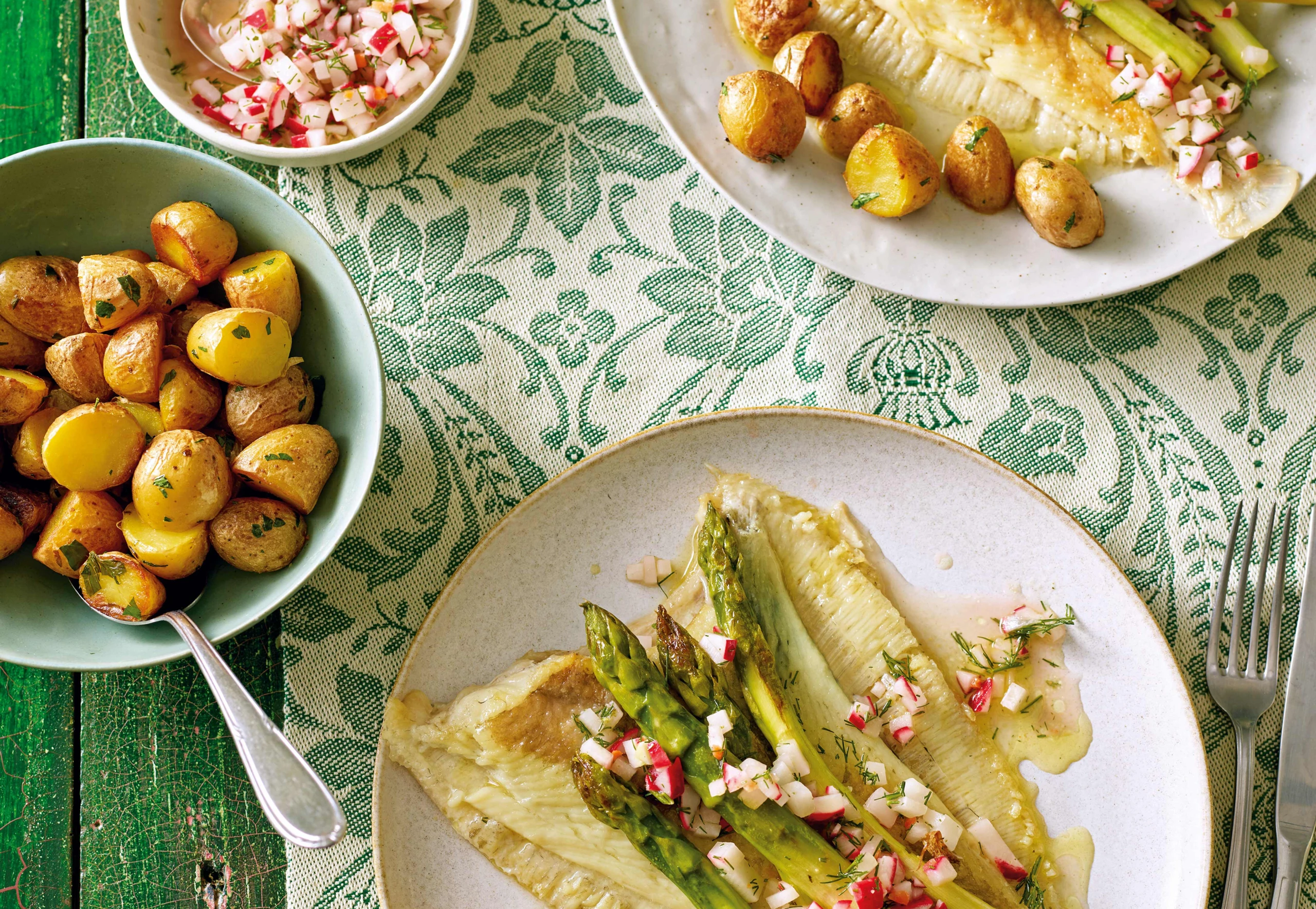 Maischolle mit Radieschen-Dill-Vinaigrette und grünem Spargel