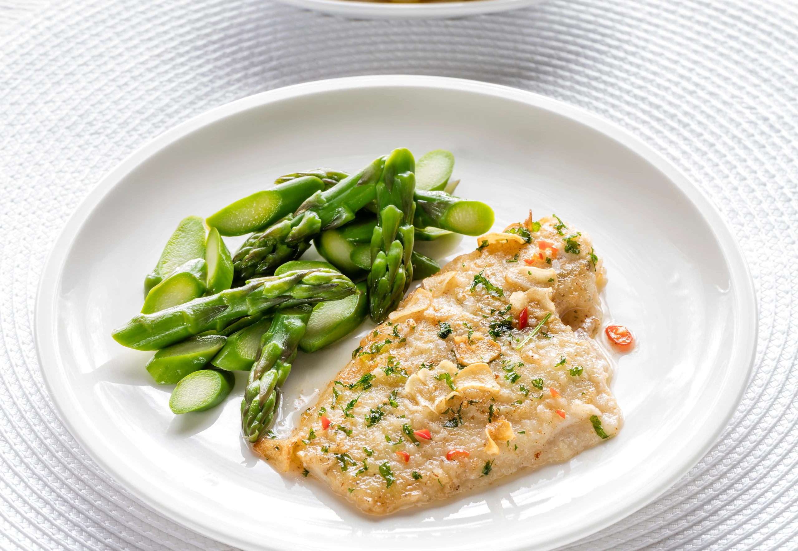 Schollenfilets mit Spargel und Gnocchi anrichten. Gnocchi mit Parmesan bestreuen.